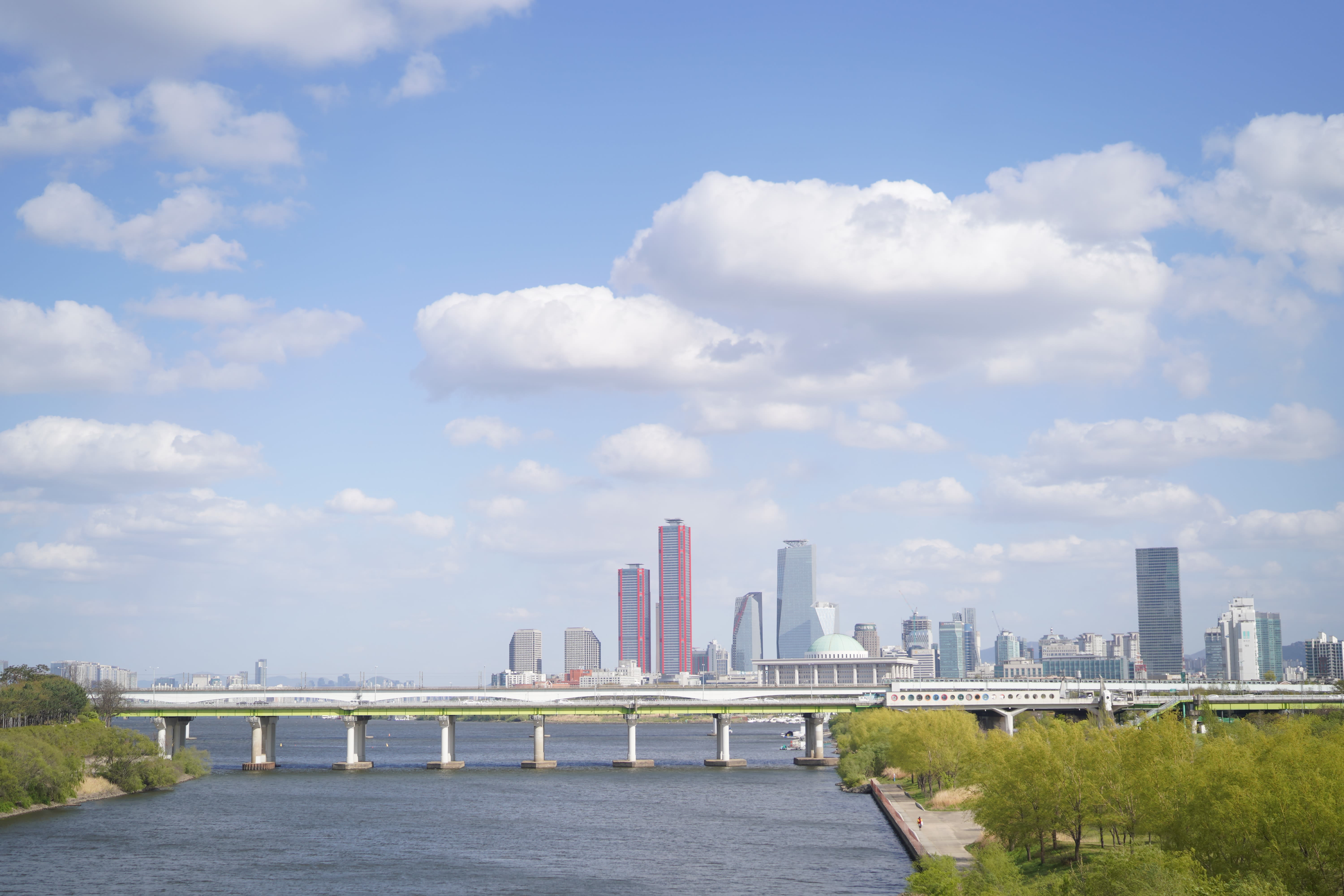 Yanghwa Hangang Park to Mangwon Hangang Park course via Seonyudo Park. Let's take a walk between the green trees and the river for some healing time. The highlight of this course is the view of the National Assembly Building from Seonyudo Park. The combination of the building, tall skyscrapers, and the surrounding green trees creates a stunning view.