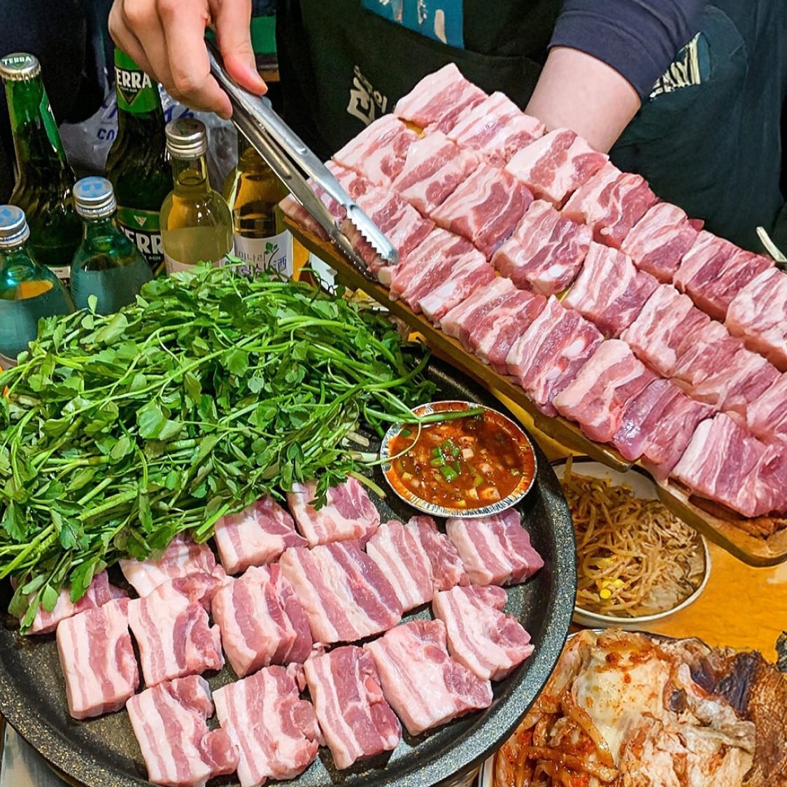 Have you heard of Minari Samgyeopsal, which Seventeen members also love to eat? Minari is a healthy ingredient packed with vitamins and fiber. We've gathered some of the trendiest minari dishes that are a hit in Korea. Beyond the classic Minari Samgyeopsal (pork belly), this veggie goes well with gukbap (rice soup), and even Korean pancakes. If you're coming to Korea, why not try some delicious minari dishes like the locals?