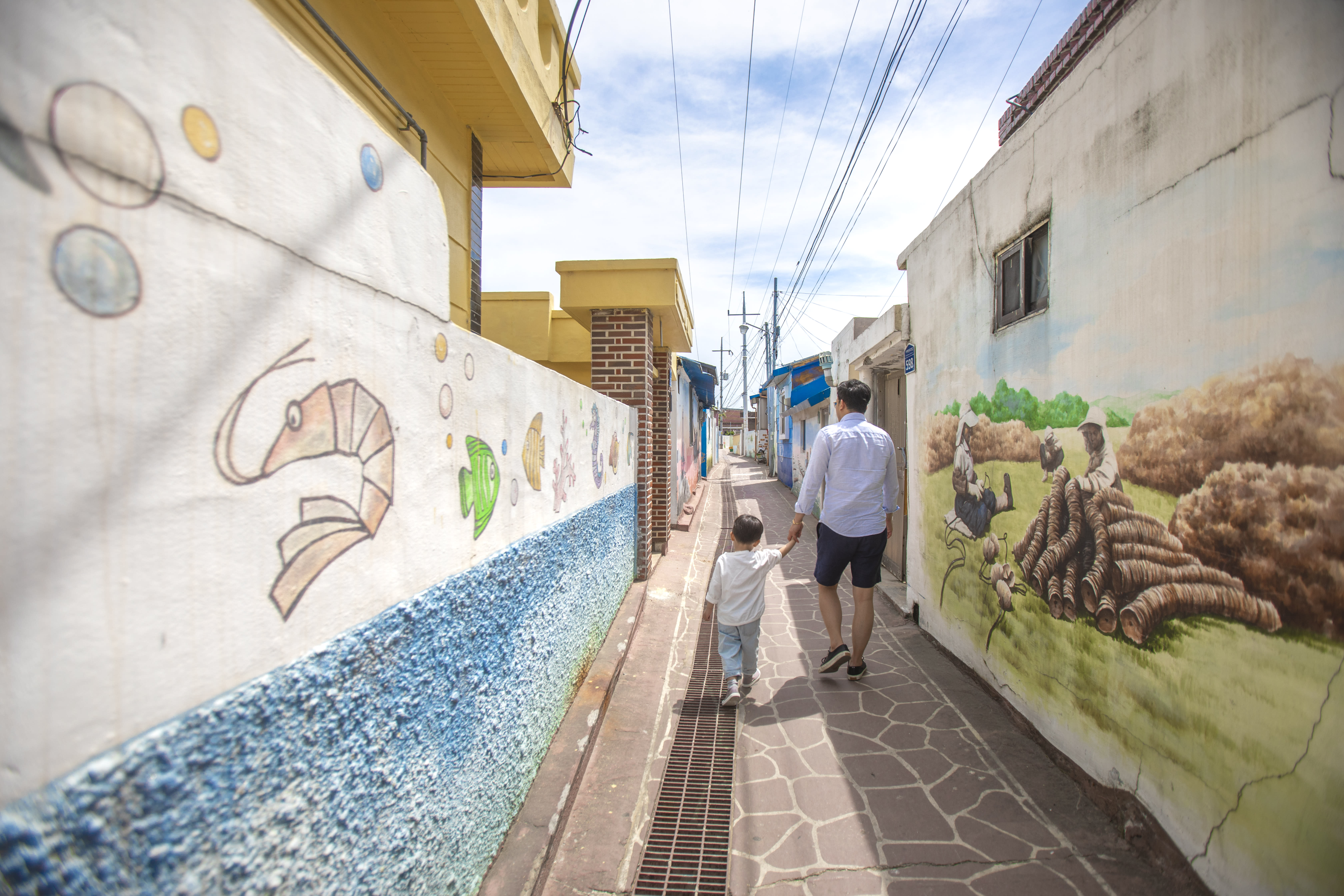 Jeonggeo Village is a port village on Nulchado Island, which is part of Gadeokdo Island in Busan. The village's alleys are decorated with murals, which will delight your eyes as you walk. The murals are not grandiose and colorful, but they depict scenes from the village and its residents, giving it a warm and welcoming atmosphere. It is a quiet port village that few people visit, so taking a walk is a good way to experience it.
