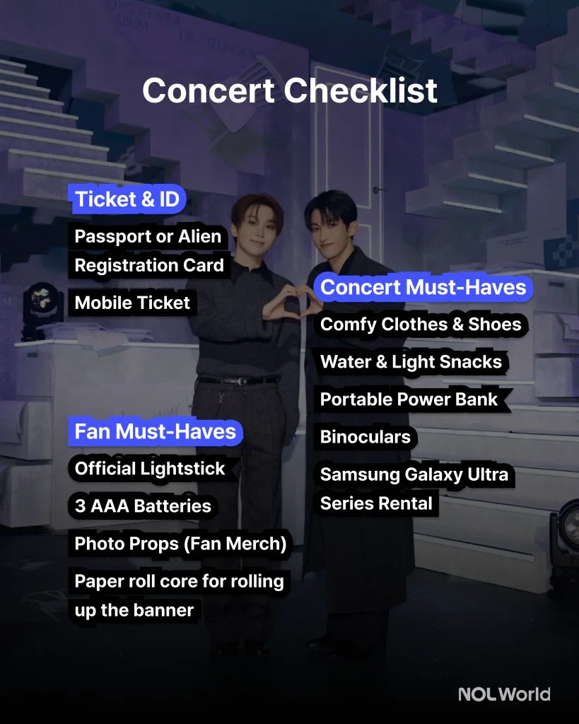 Don’t forget to bring your ID, your official light stick, and extra batteries. For memorable photos, bring some fan merch like photocards or plushies. If your seat is farther from the stage, a pair of binoculars will come in handy, too. With this checklist, you’ll be all set for the concert! ✨