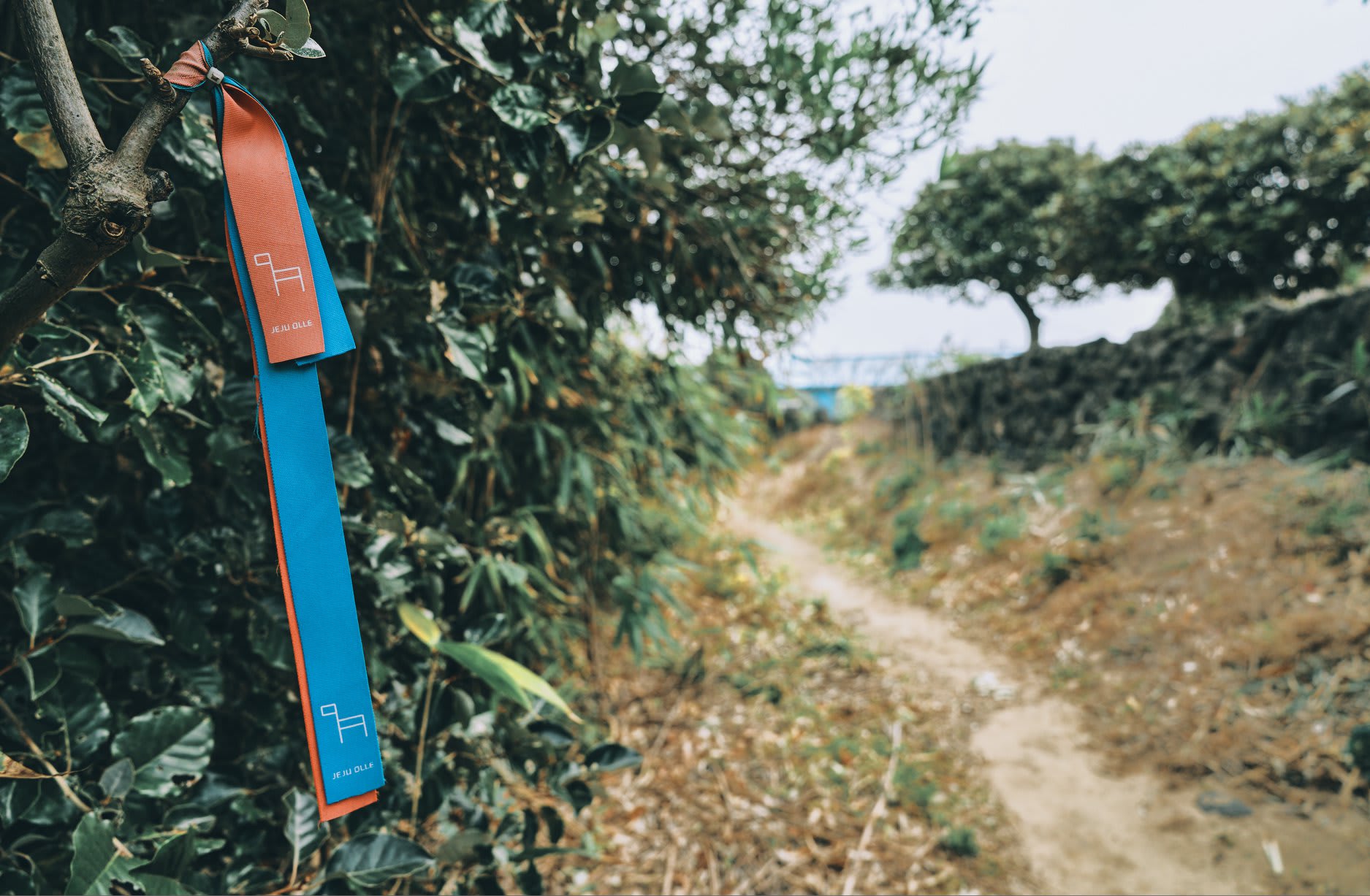 Let's look for blue and orange ribbons hanging from branches or phone poles in the center of the course. You won't get lost if you pay close attention to the ribbon. Jeju boasts numerous theme roads in addition to the Olle Trail. These roads have different guide ribbons, so proceed with caution!