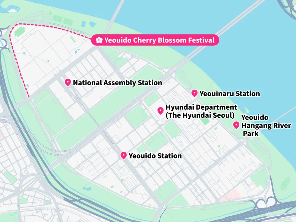 The National Assembly Station or Yeouinaru Station are the closest stations to the festival. Step out of Yeouinaru Station Exit 2, and you can enjoy cherry blossoms along the Hangang River.