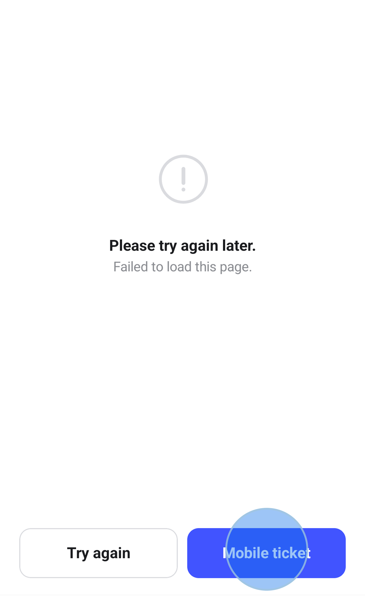 3️⃣ When the [Please try again later] page appears, select the [Mobile ticket] button at the bottom right.