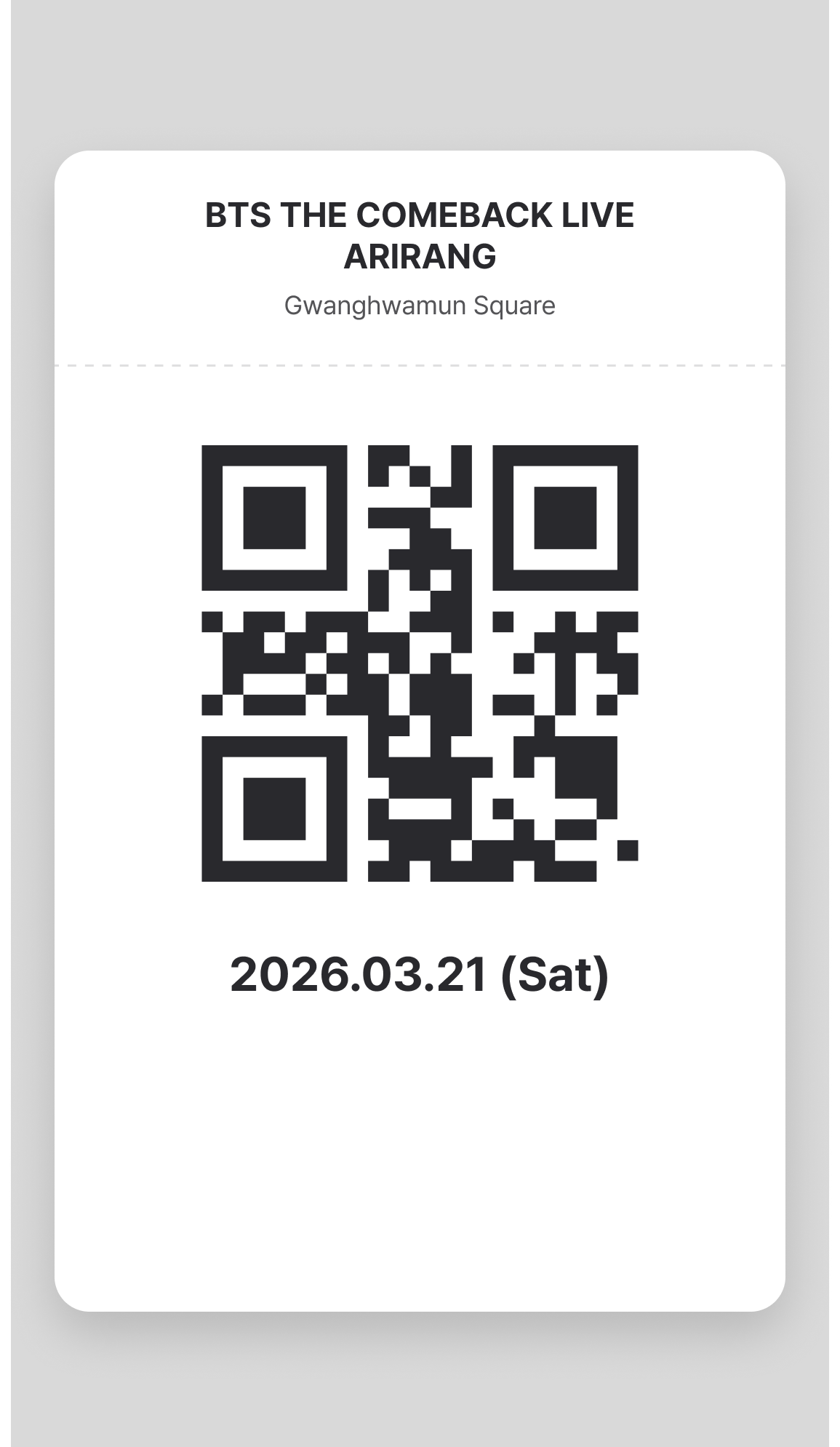 The BTS THE COMEBACK LIVE ARIRANG, scheduled for March 21 at Gwanghwamun, is fast approaching. Due to the large crowds expected on the day of the show, network connections may be unstable. To ensure a smooth ticket check and fast entry, we highly recommend saving your mobile ticket for offline use before arriving at the venue.