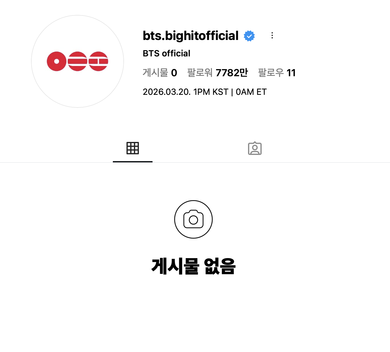 Their official Instagram account has been wiped clean! 12 years of posts—gone overnight. The account now stands empty, save for a single date: March 20, 2026 (1 PM KST / 12 AM ET). Media outlets are calling it the 'calm before the storm.' With the stage set for a fresh start, what will be the first post to drop on this blank canvas? Global ARMYs are watching closely.