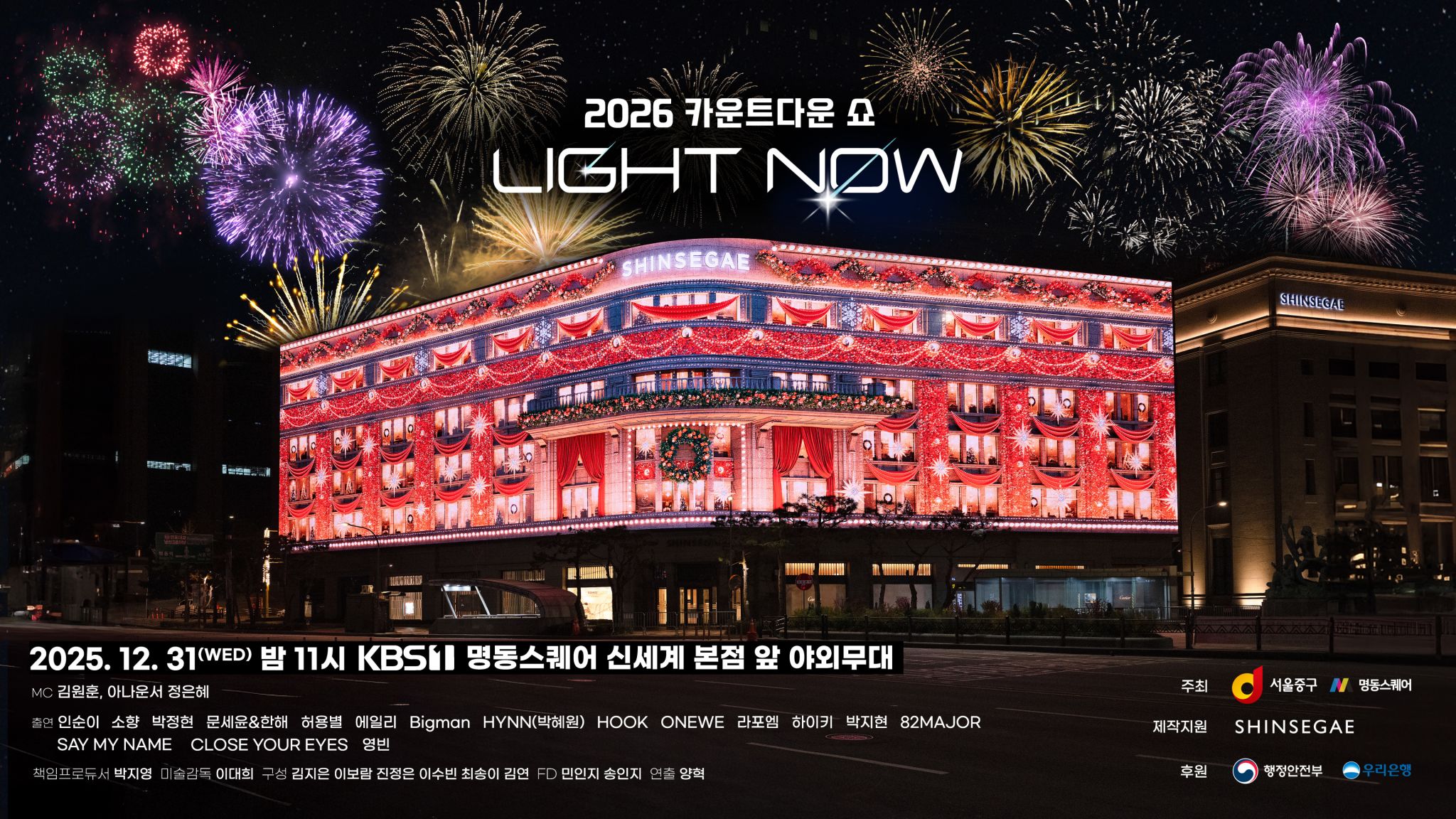 A special New Year's Eve in the heart of Seoul! A countdown event will be held in front of Myeong-dong's mega media facade. Jung-gu District, Seoul, will set up an outdoor stage centered around the Shinsegae Department Store Main Branch's media facade and host the '2026 Countdown Show Light Now'. There will also be a fireworks show and K-POP performances. This is the first time a large-scale countdown event is being held in Myeong-dong, so enjoy this meaningful event! 📍 Outdoor stage in front of the Shinsegae Department Store Main Branch, Myeongdong Square 🗓️ Dec 31, 2025 (Wed) - Jan 1, 2026 (Thu)