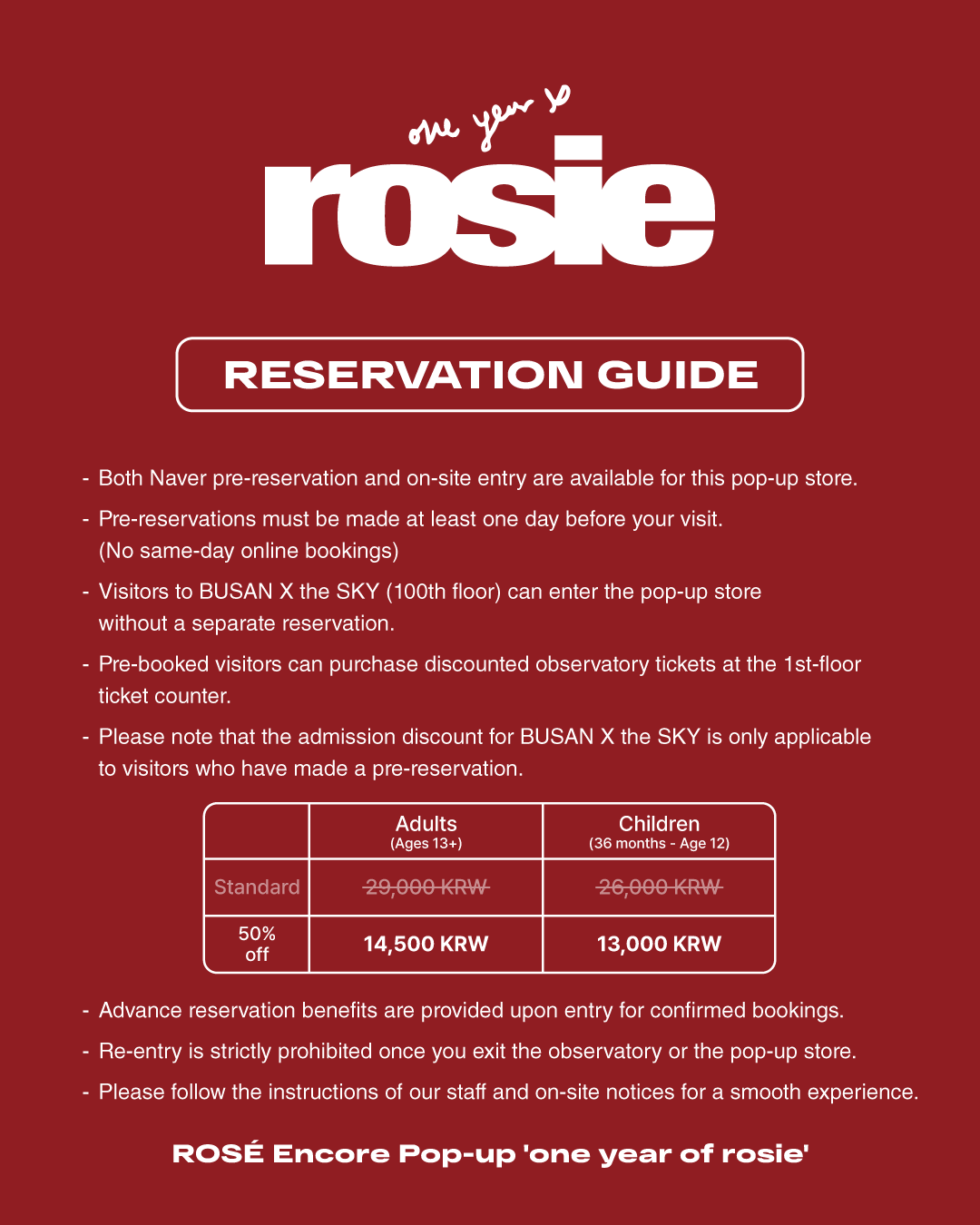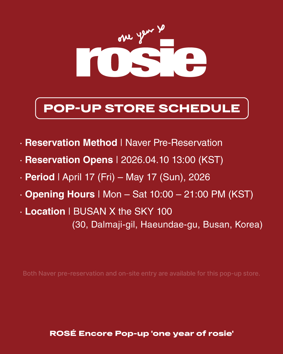 An encore event for the pop-up store held to celebrate the release of ROSÉ's first full album 'rosie' will also be held in Busan. The 'one year of rosie' encore pop-up store, which was held in Seoul last January, received a lot of love from fans. Thanks to that love, it's coming to Busan's iconic landmark, 'BUSAN X the SKY 100'. Enjoy ROSÉ's pop-up event with the breathtaking view of the Busan sea from the 100th floor. Your trip to Busan will be much richer. 📍 BUSAN X the SKY 100 🗓️ Apr 17 (Fri) - May 17 (Sun), 2026