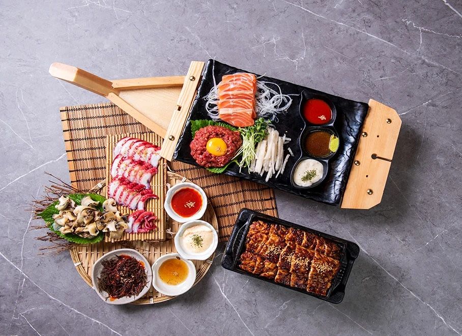 3 oversized grilled eels, Yukhoe, salmon, octopus, Sora Sukhoe (cooked horned turbans), etc.