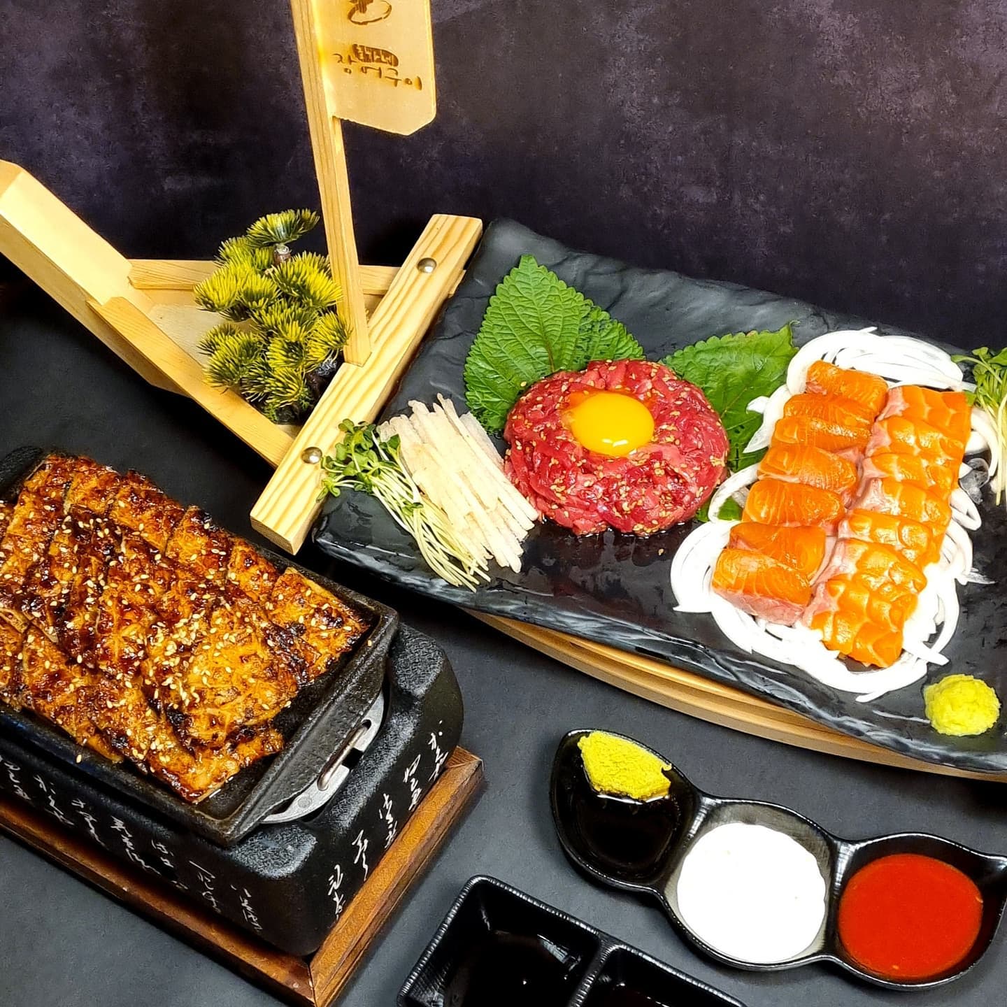 3 large grilled eels, Yukhoe, and salmon