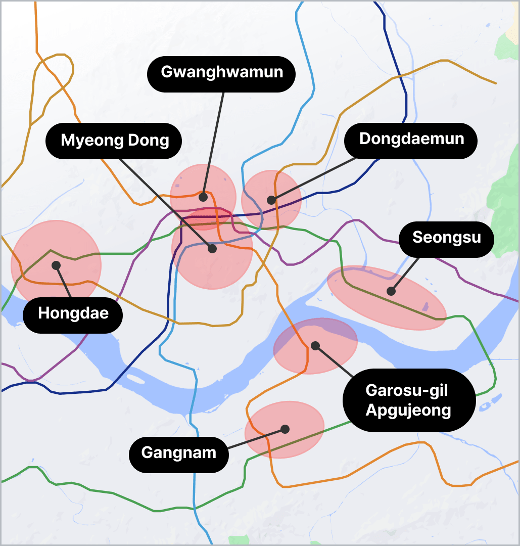 Located in the southern part of the Hangang River, Gangnam Station is a transportation hub. It is known for its high population density, which has led to significant commercial development. The area boasts large and diverse shopping malls like Starfield and Lotte World Mall, offering the convenience of fulfilling all your needs in one place. With its many high-rise buildings, Gangnam exudes a modern atmosphere, and its booming beauty industry makes it a perfect destination for those seeking cosmetic procedures.