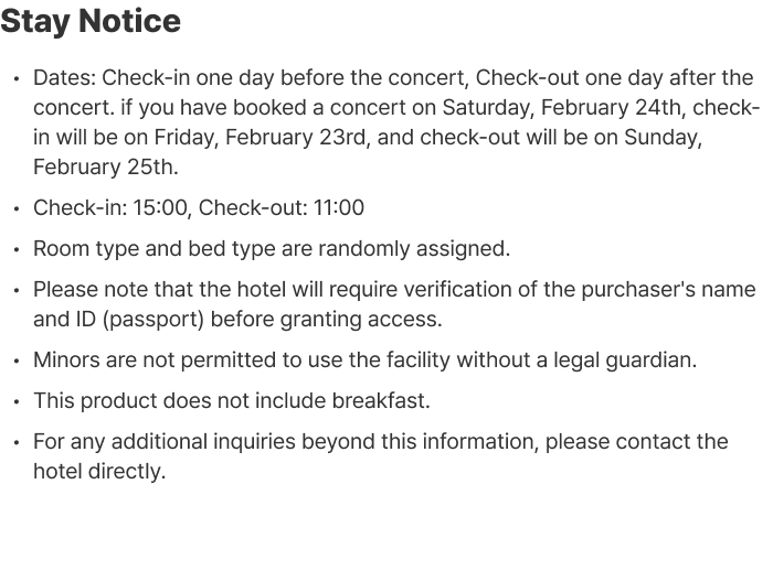 • Cancellation for both accommodation and performance is processed together, and partial cancellations are not possible.