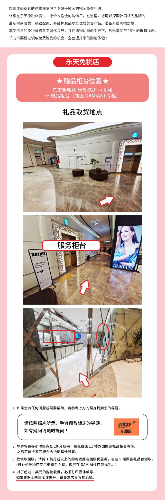 【江南通行证-免费礼品与特别优惠券】 ※ 最佳购物体验?全部免费送给您!! 在乐天免税店享受精彩购物日,汇集韩国顶级品牌的最新时尚潮流、配饰、护肤必备品和美妆产品。 以无与伦比的免税价格,搭配您的专属优惠券,并通过购物导游再享高达 15% 的额外折扣,尽情购物吧! 立即领取您的免费好礼,提升您的购物体验!! ※ 乐天免税店折扣优惠券 ※ 适用门店:明洞总店、蚕室世界塔店 ① 10,000 韩元折扣券 ② VIP 折扣券(最高 15%)