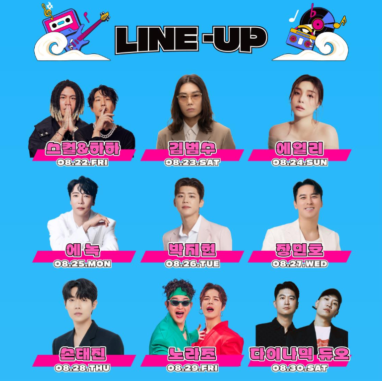 - A star-studded lineup featuring Korea’s top artists, including Skull & Haha, Kim Bum-soo, Ailee, Enoch, Park Ji-hyun, Jang Min-ho, Son Tae-jin, Norazo, and Dynamic Duo!