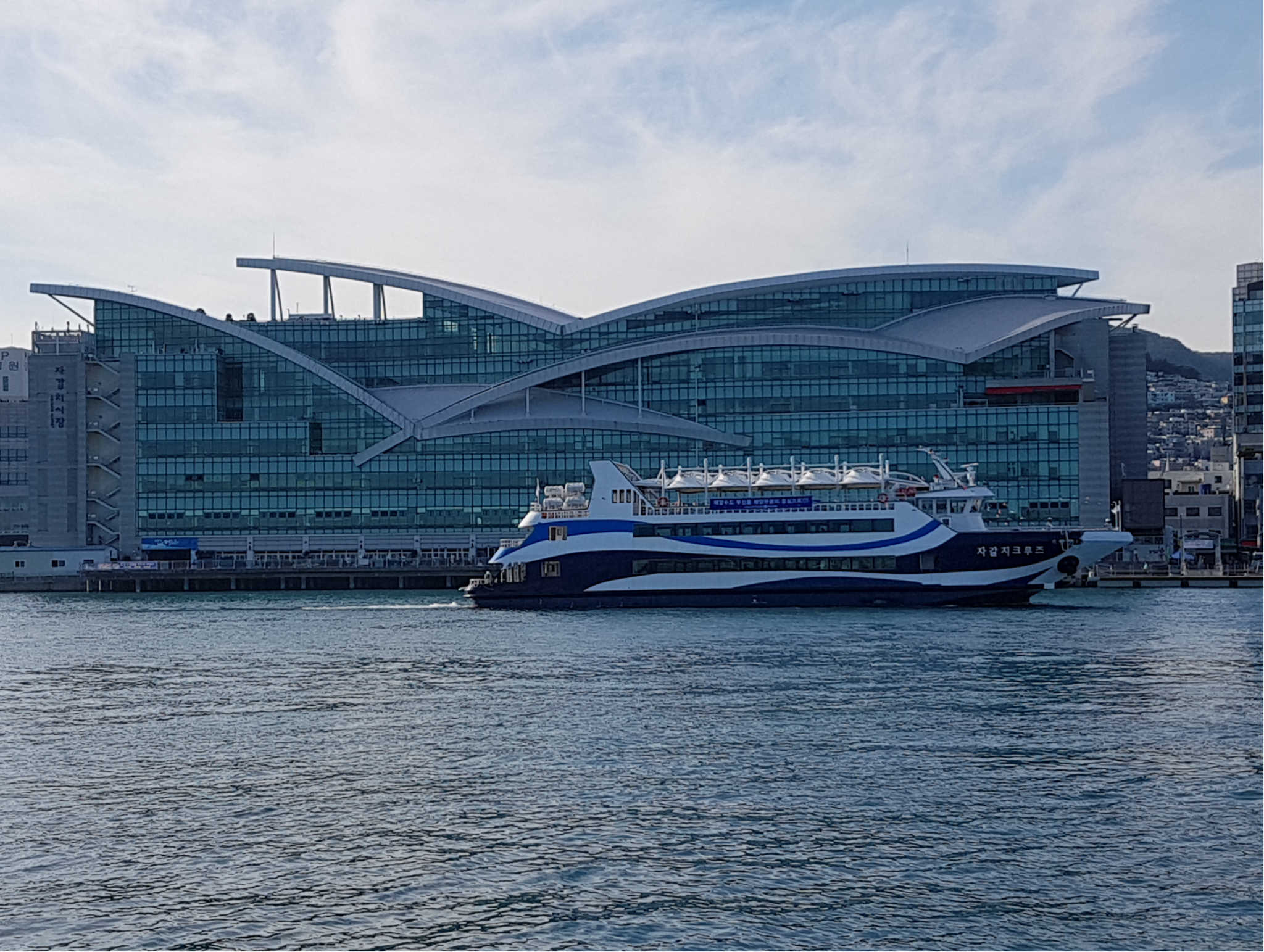 釜山札嘎其市场出发的邮轮。 在邮轮上看看釜山美丽的大海和城市吧。