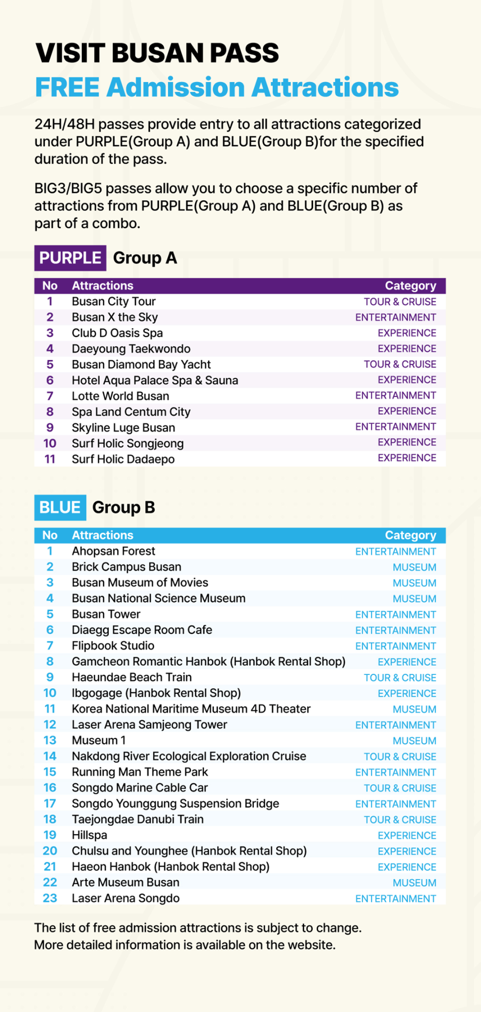 - With a single pass, anyone can freely enter over 34 paid tourist facilities in Busan and enjoy discount at more than 150 tourist facilities including restaurants, shopping, activities, accommodations and more.
