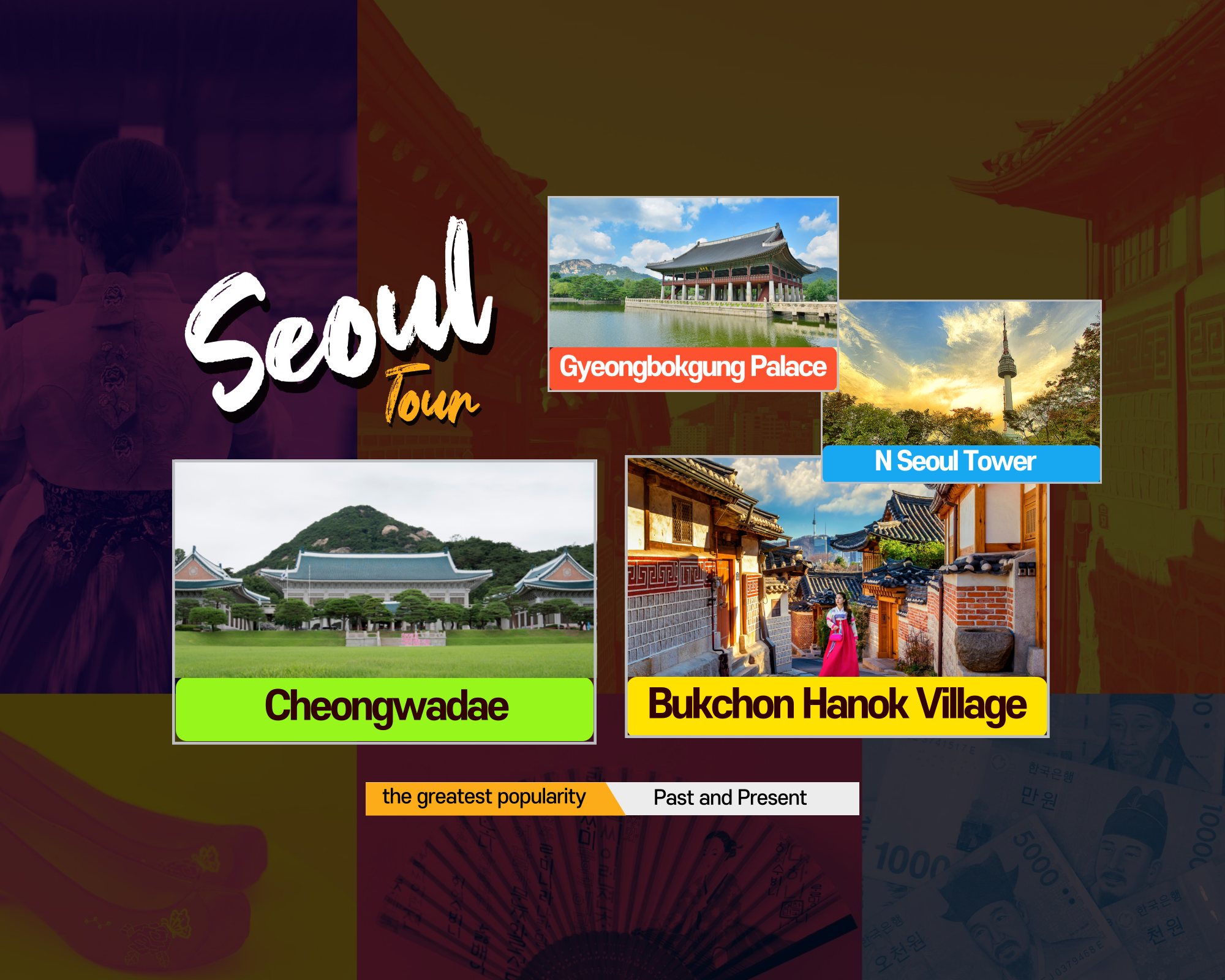 - Take you to the famous places in Seoul : N Seoul Tower , Gyeongbokgung Palace, Bukchon Hanok Village