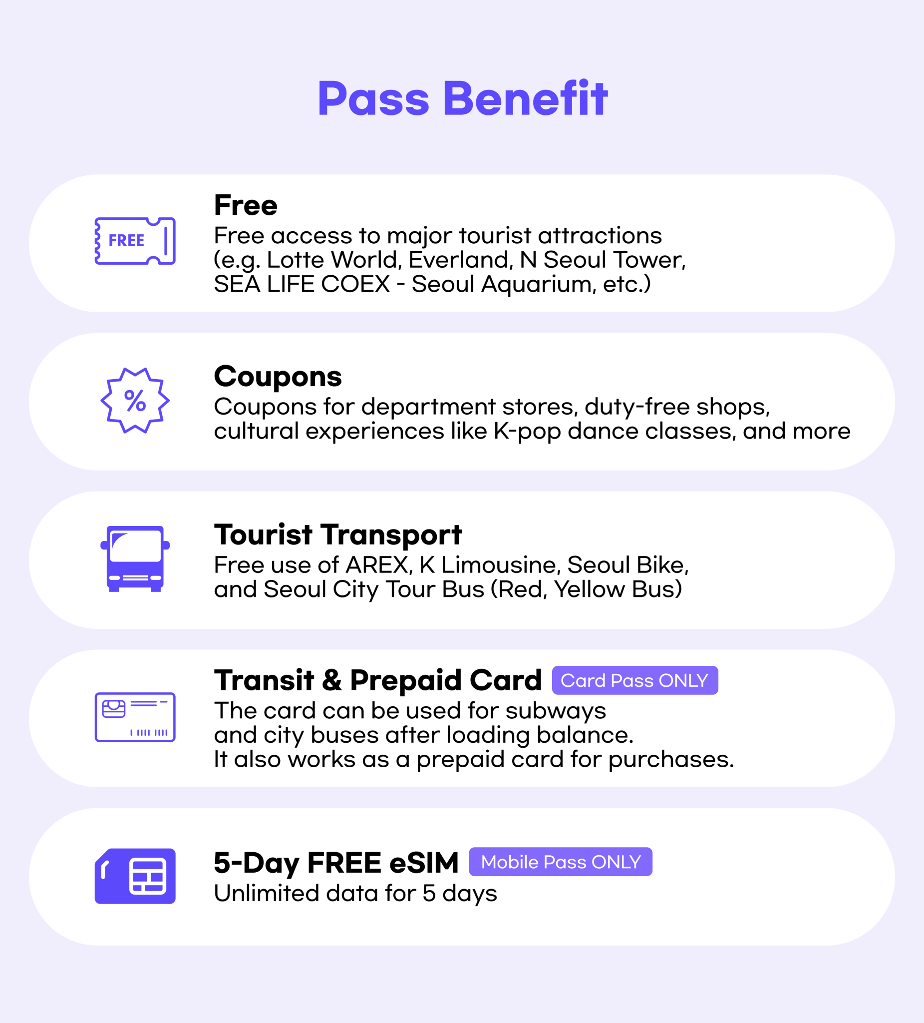 Enjoy free entry to major attractions and stay connected with a 5-day eSIM. The perfect Seoul tourist pass for K-pop fans and travelers. Book now and explore Seoul!