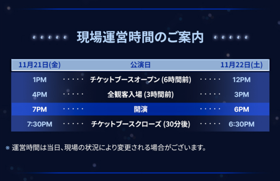 全ての観客が公演開始3時間前から入場できます。公演初日と2日目で入場時間が異なるためご注意下さい。