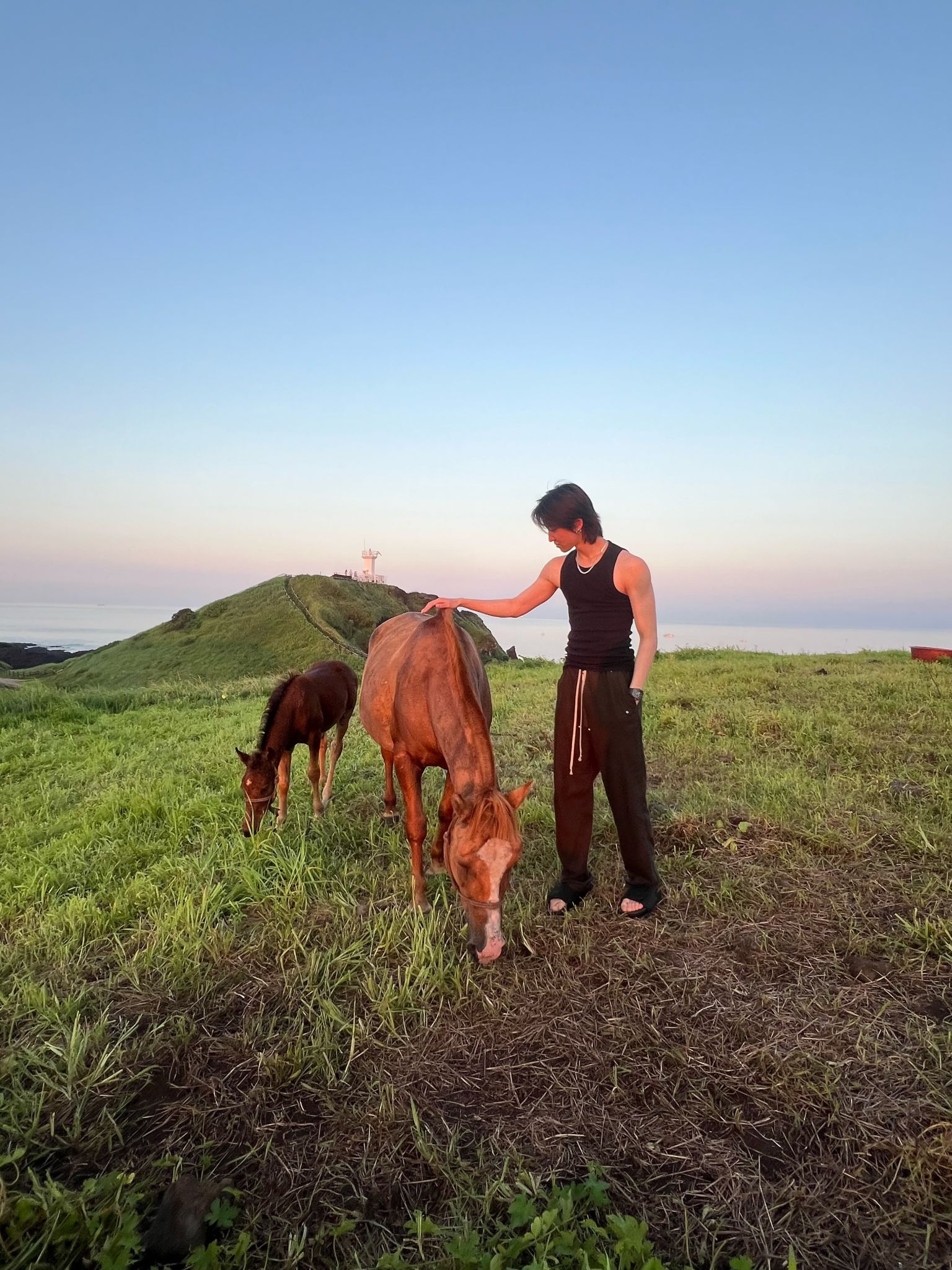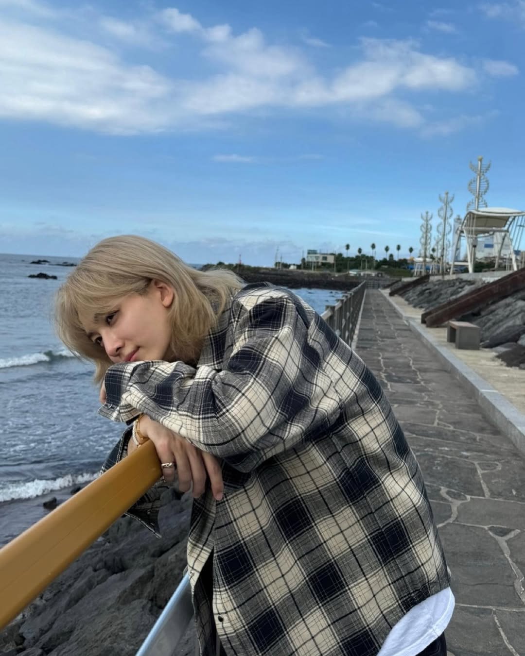 240805 THE 8がWeverseに投稿したスポット。海岸の断崖に沿って続く散策路が美しく、城山日出峰を望む開放的な景色は圧巻です。THE 8と同じ背景で、写真を撮ってみましょう。