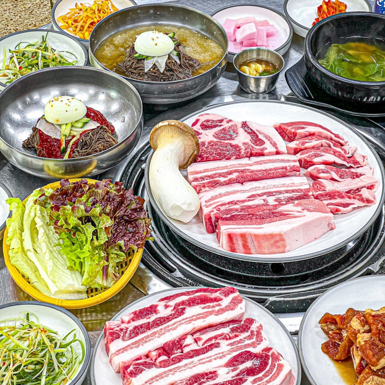 スングァン「ビンゴトリップ」撮影地。お菓子当てゲームをクリアして、ついに念願の黒豚焼肉を食べられたシーンで訪れたお店がここ。分厚い肉を炭火で焼き、旨みを閉じ込めた香ばしい味わいが絶品です。