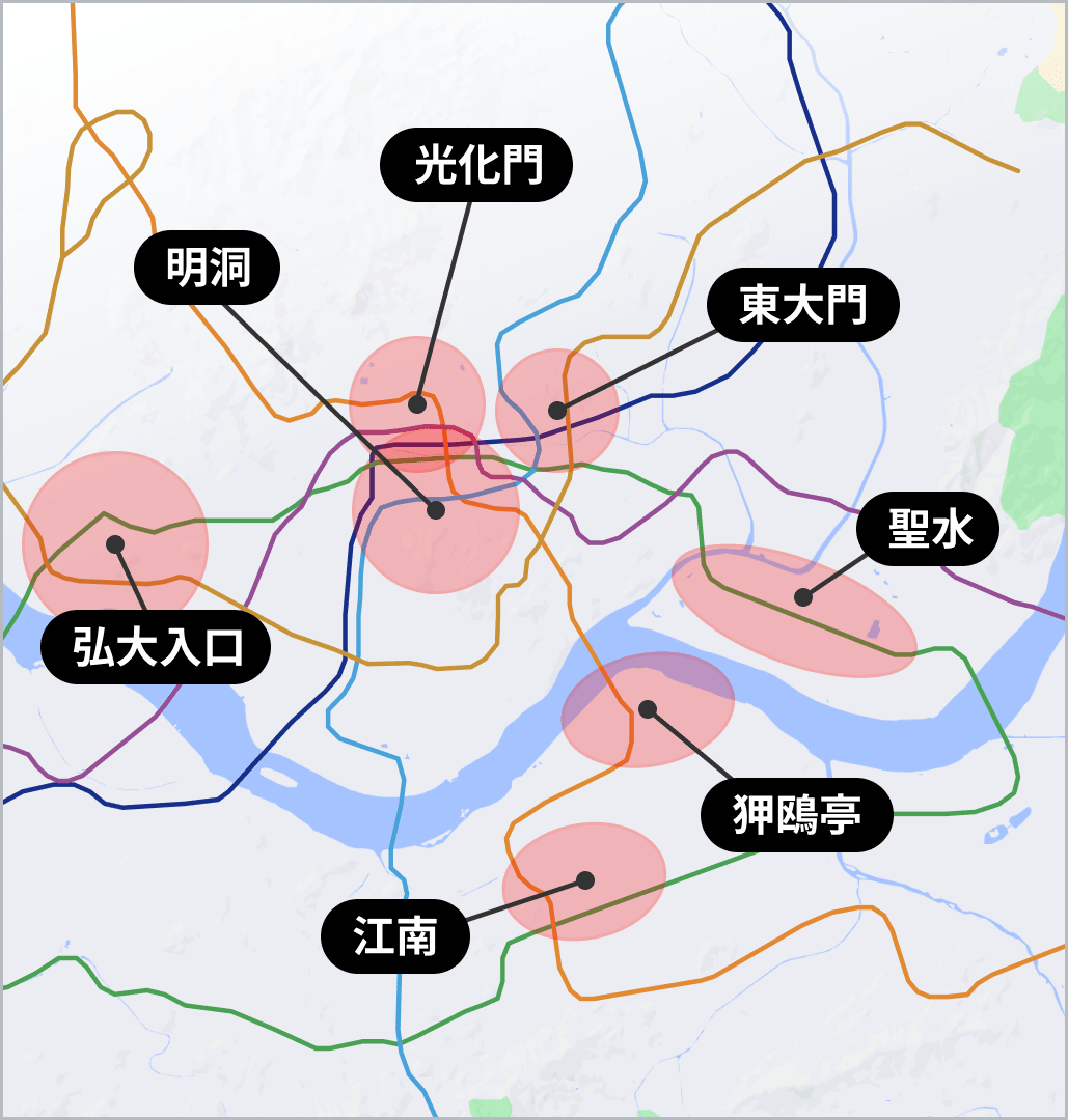ソウルは漢江(ハンガン)を境に南北に分かれ、雰囲気が異なります。昔ながらのソウルを楽しむなら江北(カンブク)エリア、大都市の雰囲気を感じるなら江南(カンナム)エリアがおすすめ!また、若者に人気の弘大(ホンデ)と聖水(ソンス)は、それぞれソウルの東と西に位置しています。公共交通機関を利用すればどこも1時間もかからず移動できるので、旅行プランの参考にしてみて。