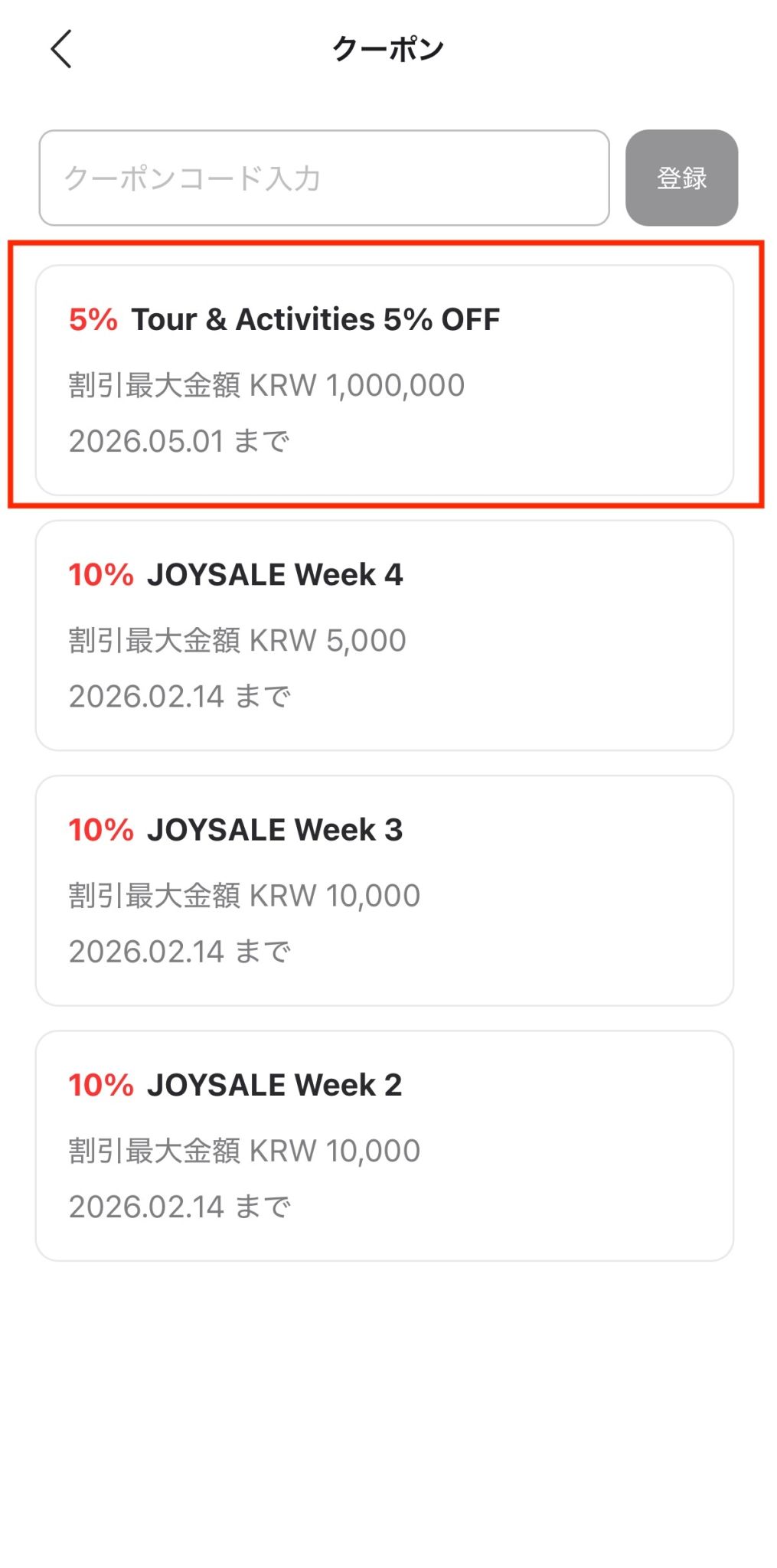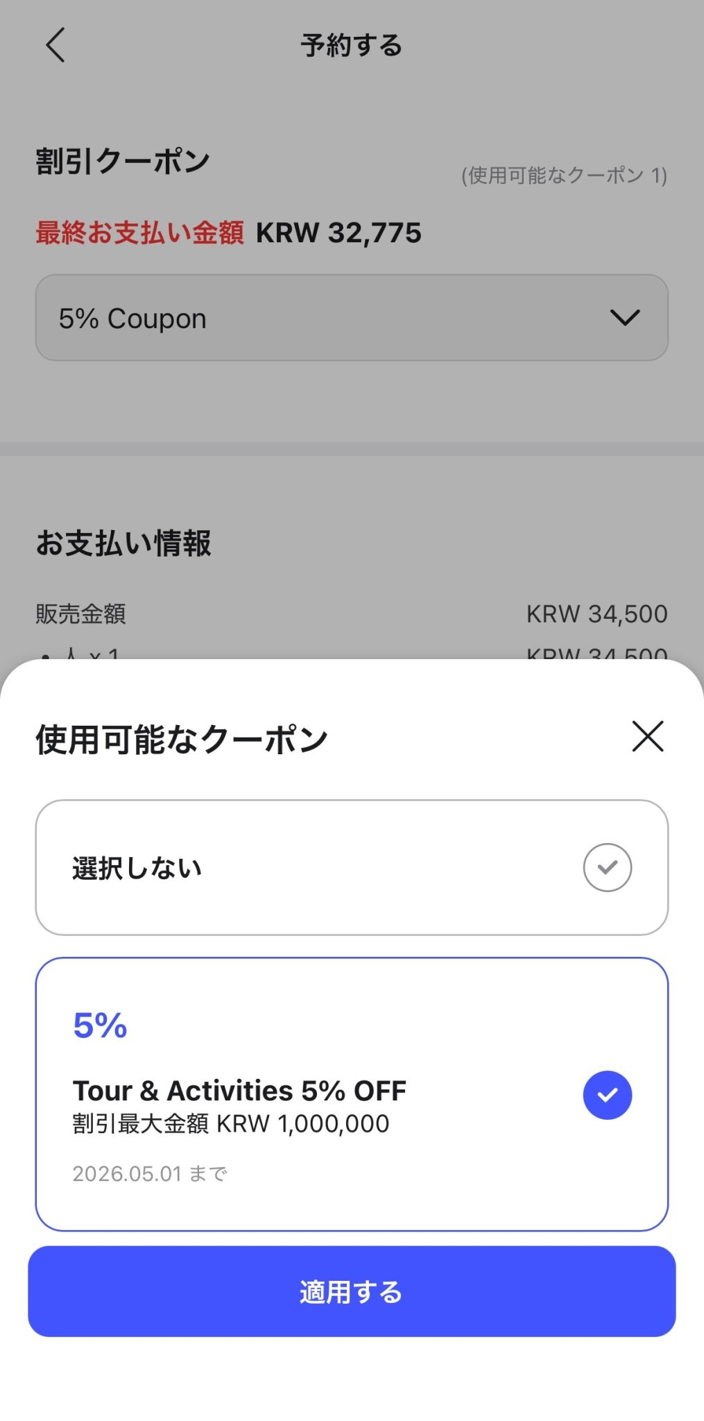 - 確認方法: マイページ > クーポン > [Tour & Activity 5% OFF] クーポン