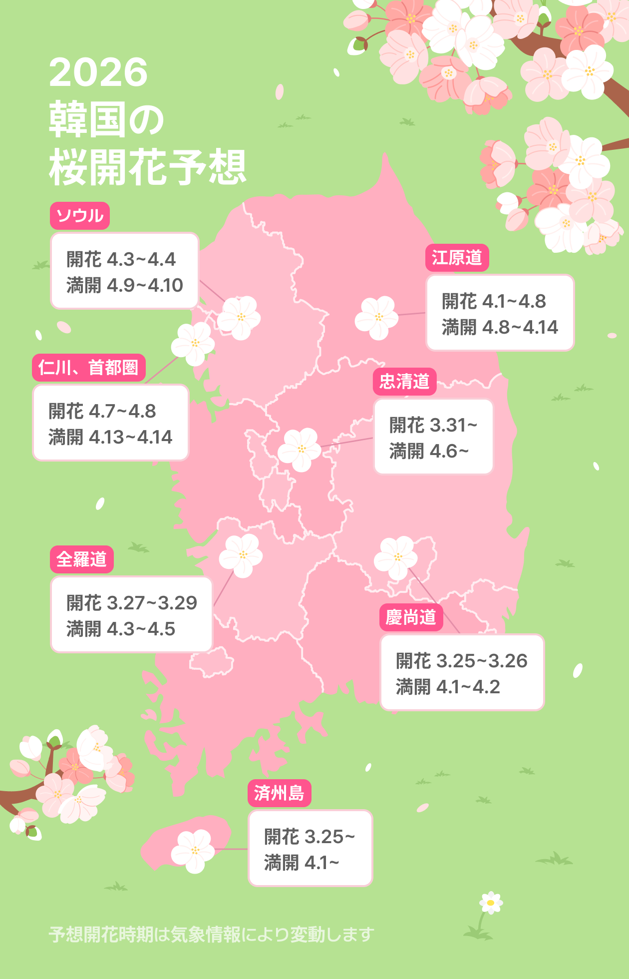 韓国の桜は、済州島や釜山をはじめとする南部地域から咲き始め、通常は3月下旬から4月初旬にかけてソウルに到達します。このガイドでは、今年の桜シーズンの情報と、全国の桜スポットをご紹介します。