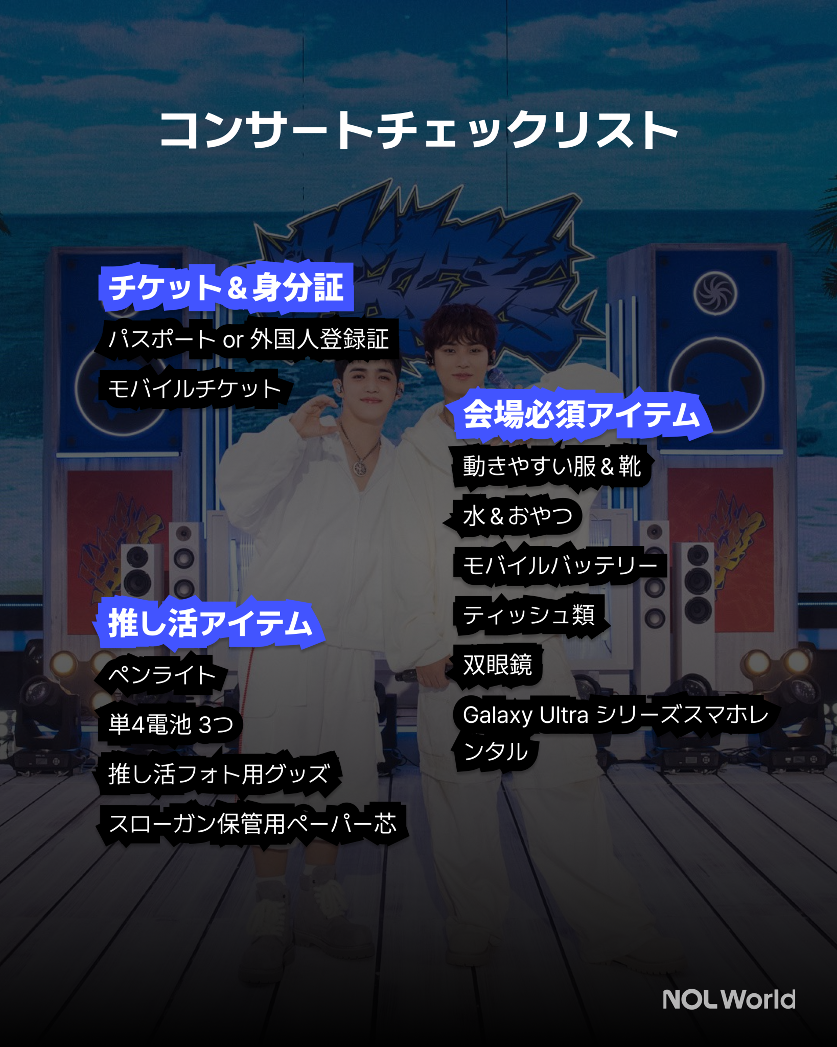 身分証と一緒にペンライトと予備の電池を忘れずに持参しましょう。フォトカードや人形など記念写真のためのグッズを持参するのもおすすめです。席が遠い場合は双眼鏡があるとよいでしょう。