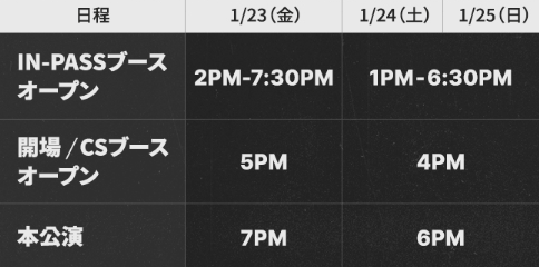 ソウルから出発する場合、大林駅、ソウルドラゴンシティからインスパイア・エンターテイメント・リゾートが運行する無料シャトルバスを利用できます。また、公演当日は、空港貨物ターミナル駅からの無料シャトルバスも運営されます。 ・空港貨物ターミナル駅2番出口前→インスパイアアリーナ ・開演開始5時間前より20分間隔で運行