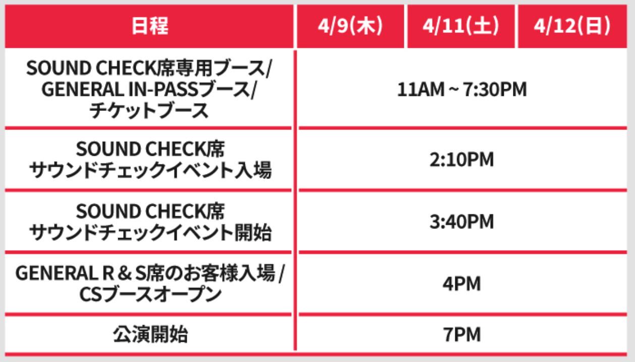 サウンドチェック席の観客とGENERAL R&S席の観客の入場時間が異なります。ご予約席の入場時間をご確認ください。サウンドチェック公演開始5時間前から入場、R&S席のお客様は公演開始3時間前から入場可能です。運営時間は、イベント当日の会場の状況により変更される場合があります。