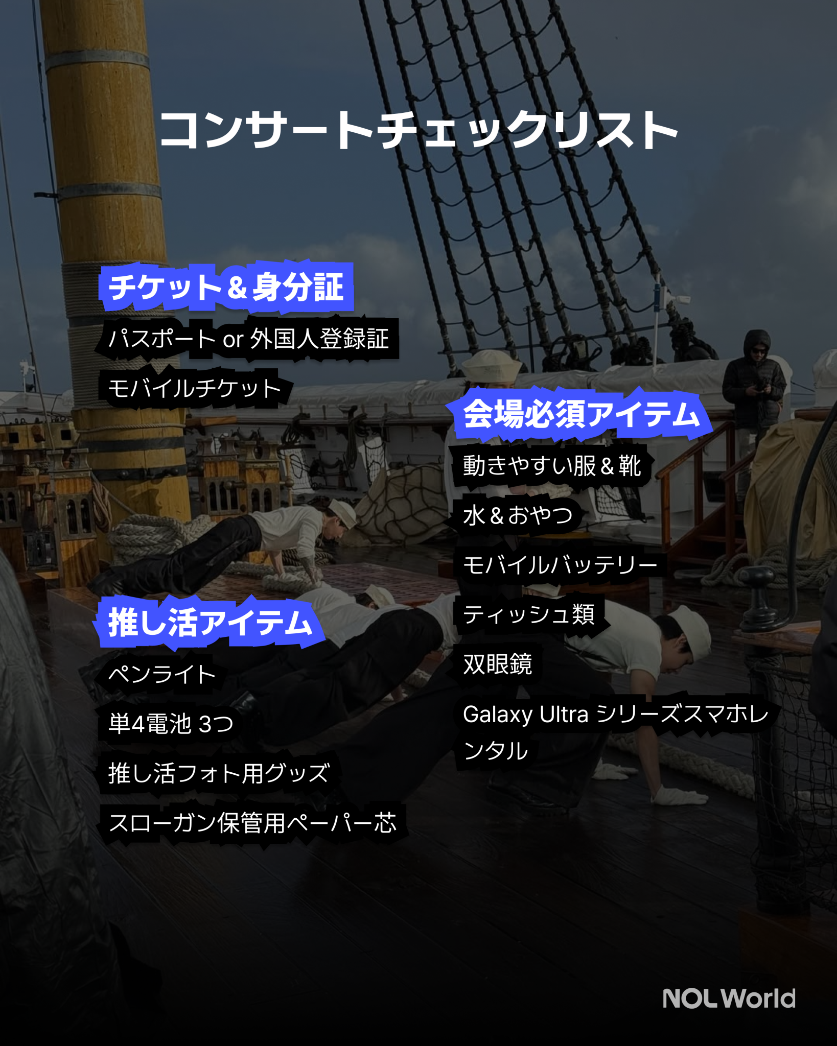 身分証と一緒にペンライトと予備の電池を忘れずに持参してください。フォトカードや人形など記念写真のためにグッズを持ってくるのもおすすめです。席が遠い場合は双眼鏡があるとよいでしょう。