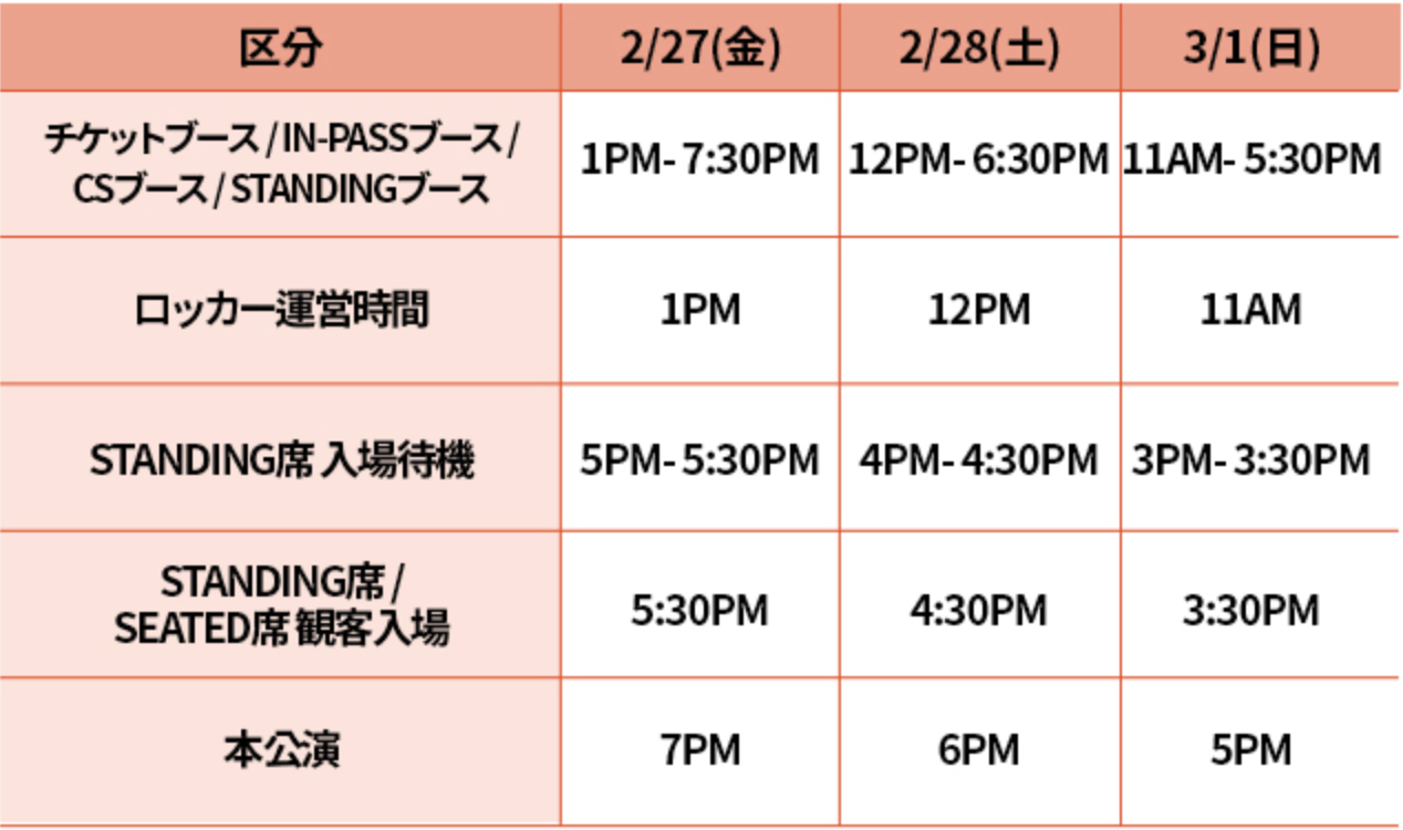 チケット種別およびエリアごとに入場時間が異なります。予約した座席の入場時間を必ずご確認ください。運営時間は当日の会場状況により変更される場合があります。