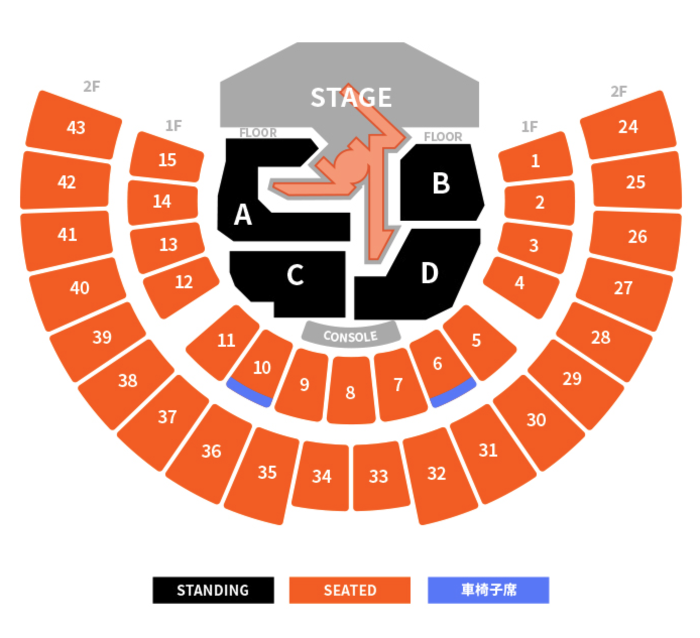 スタンディングエリア(フロア)と座席エリア(1階、2階の階段式指定座席)で運営されます。チケットのエリアをご確認ください。
