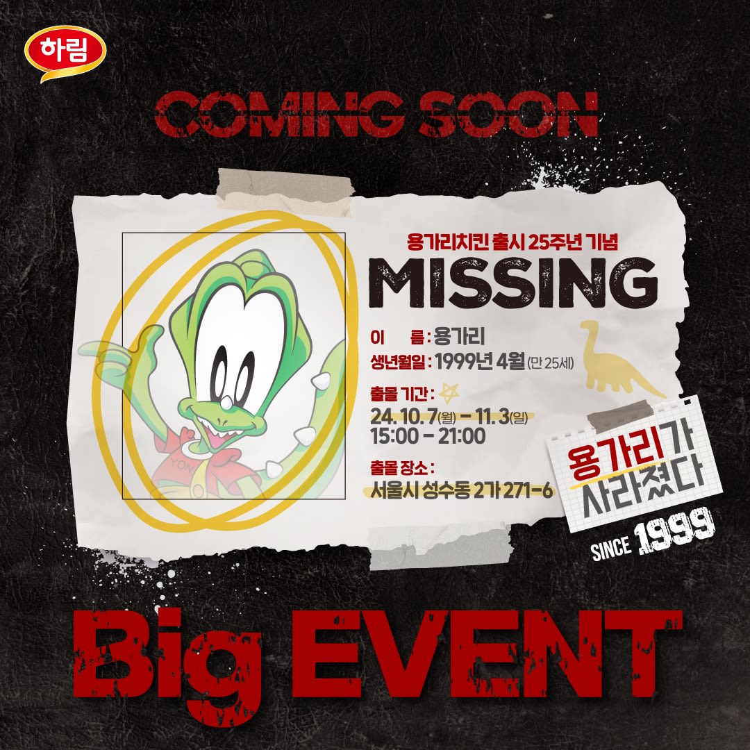 1999年に発売された「ヨンガリチキン」が25周年を記念してポップアップストア「ヨンガリが消えた」を聖水(ソンス)にオープンします。 可愛いキャラクターヨンガリ。90年代の音楽が響き渡る空間で2つのコンセプトのヨンガリを見ることができます。訪問予約は下記のインスタグラムプロフィールリンクからご確認いただけます。限定版の人形がもらえるゲームにも参加できるので、興味のある方はぜひ立ち寄ってみてください! 📍20, Seongsui-ro 18-gil, Seongdong-gu, Seoul 🗓️10.7(月) - 11.3(日)