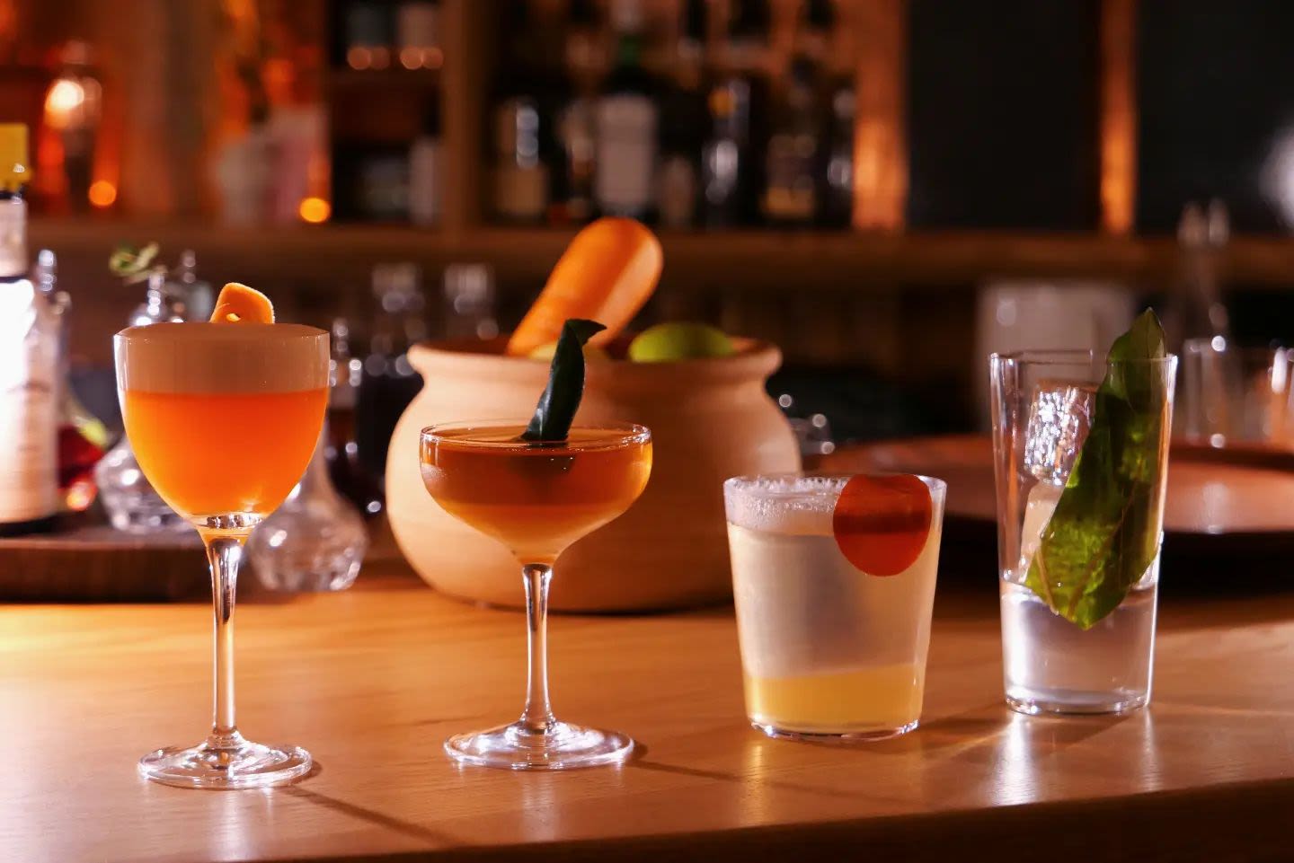 高級感漂うウッドカラーのインテリアがポイント!屋外テラスでカクテルを楽しめるバー