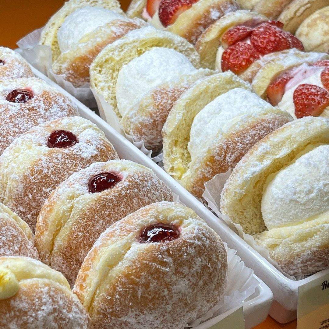透明のショーケースにクリームがたっぷり入ったドーナツがずらりと並ぶ可愛らしいカフェ