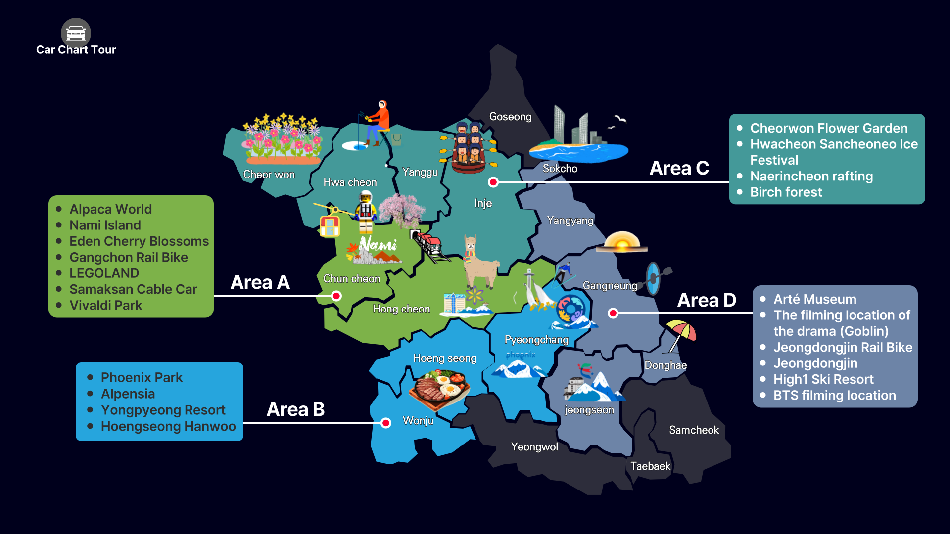 日本語を話せるプロのドライバー付き専用車チャーターでアルパカ ワールド、南怡島、レゴランドなどを含む江原道市内の主な観光スポットを巡りましょう。ホテルからお客様の旅行目的地までの安全な送り迎えサービスで、くつろいた旅をお楽しみましょう。