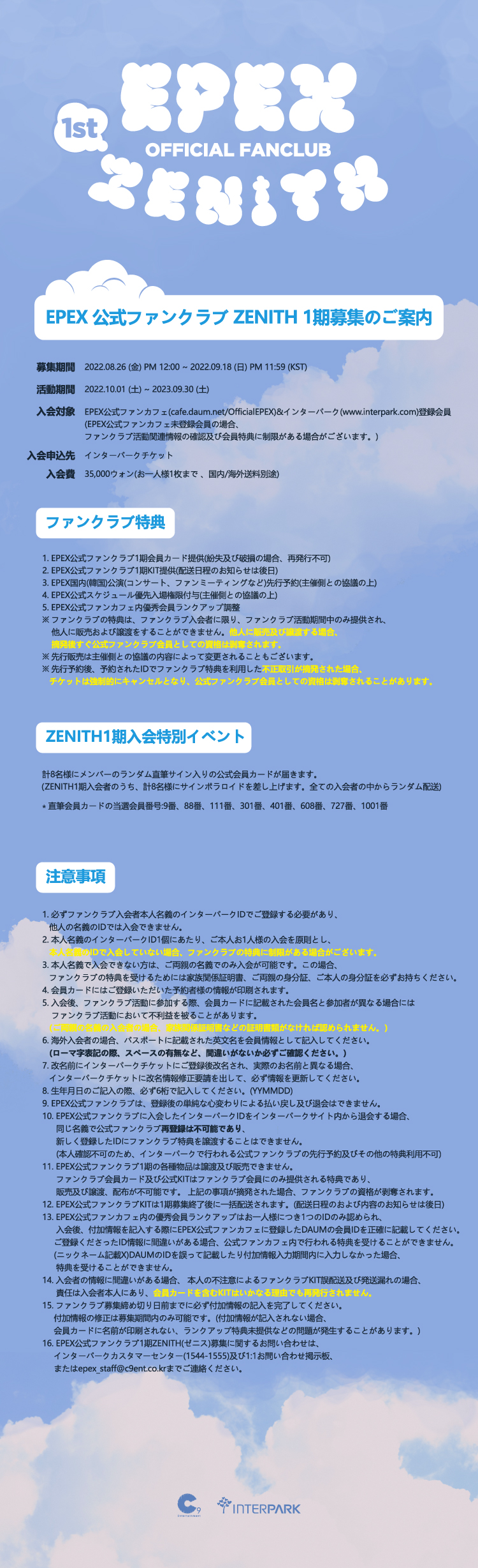 16.EPEX公式ファンクラブ1期ZENITH(ゼニス)募集に関するお問い合わせは、インターパークカスタマーセンター(1544-1555)及び1:1お問い合わせ掲示板、またはepex_staff@c9ent.co.krまでご連絡ください。