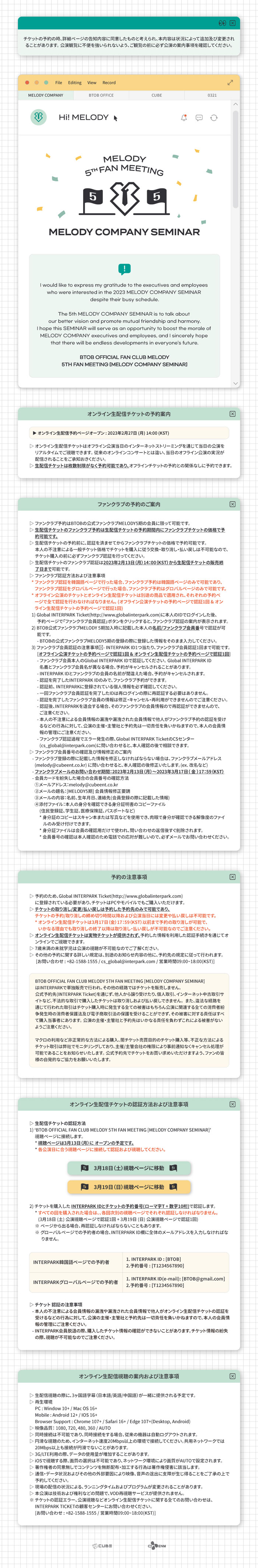 -BTOB公式ファンクラブMELODY5期認証期間 : 2023年 2月 13日(月)14:00 ~ -オンライン生配信チケットの予約期間 :2023年 2月 27日(月)14:00 (KST) ~ -チケット価格 : ファンクラブ 33000ウォン / 一般 44,000ウォン (税込) -枚数制限 : 枚数制限なし (オフラインチケットを予約するかどうかに関係なく予約可能)