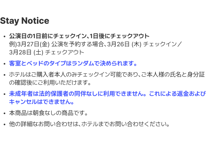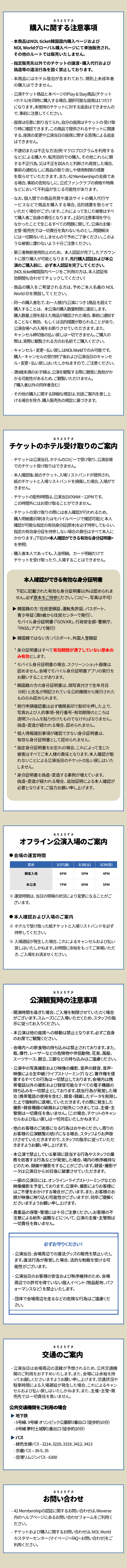 * By purchasing this product, you agree to the terms and conditions of this notice. These terms and conditions may change depending on the performance. Please carefully review the terms and conditions before attending the performance to avoid any inconvenience.