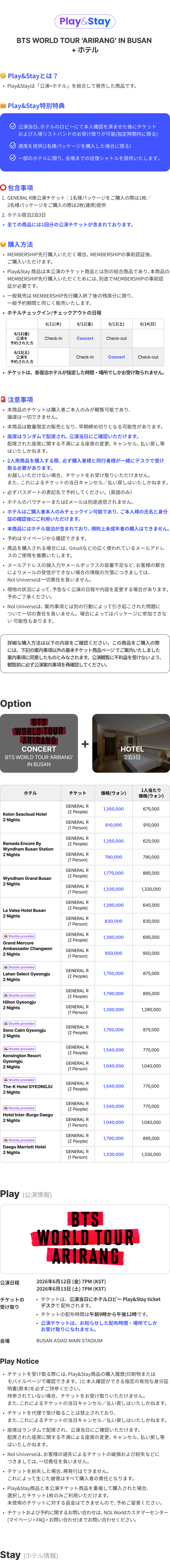 ![[Play&Stay]BTS WORLD TOUR ‘ARIRANG’ IN BUSAN + Hotels](https://ticketimage.interpark.com/Play/image/large/26/26005593_p.gif)