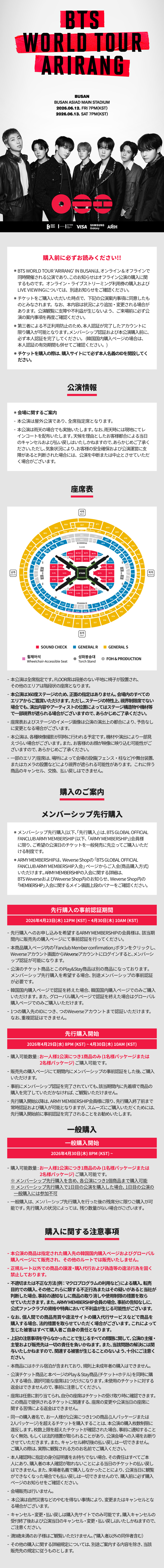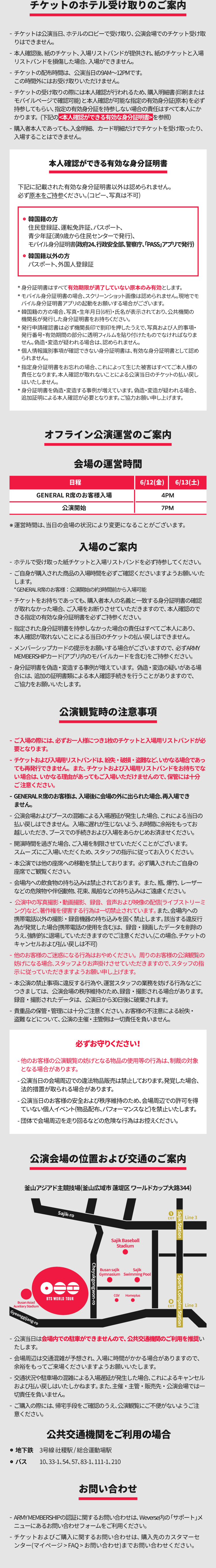※ Your seat may be subjected to different degrees of sight or audio obstruction due to structures of the venue (handrails, pillars, etc.) and the stage or camera equipment, depending on the location of the seat and individual viewing preferences. Any changes, cancellations and/or refunds due to sight or audio obstruction will not be allowed on the day of the show. Please note that concert organizers and the authorized ticket seller cannot provide any solutions to problems arising from such obstructed views.