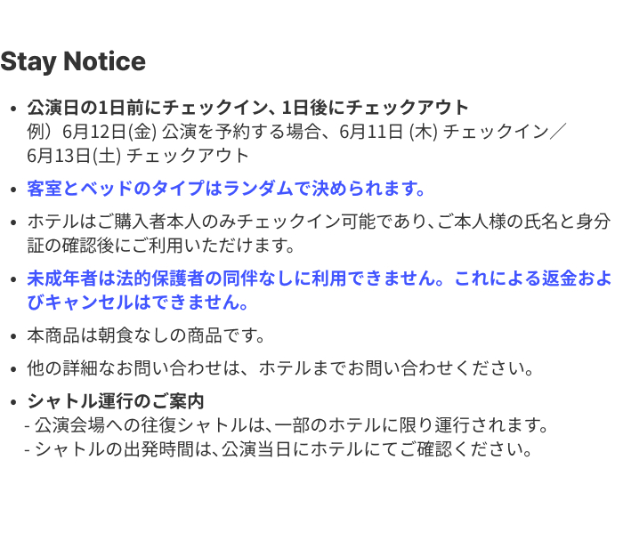 -公演会場への往復シャトルバスは、該当ホテル商品をご購入されたお客様のみご利用いただけますので、あらかじめご了承ください