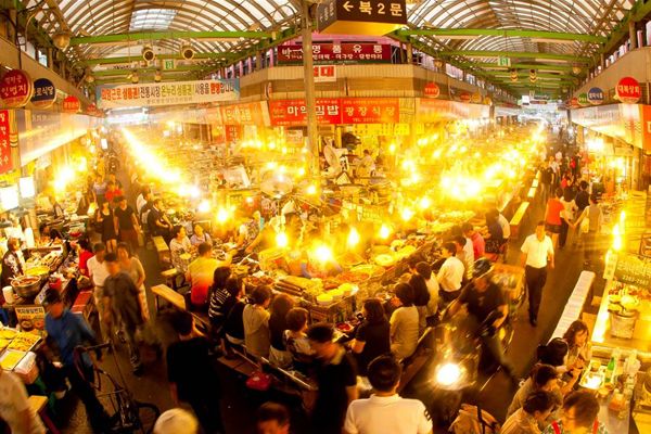 韓国在来市場の広蔵市場にてピンデトッや麻薬キムパッ、トッポキ、ユッケなどB級グルメを堪能できます。