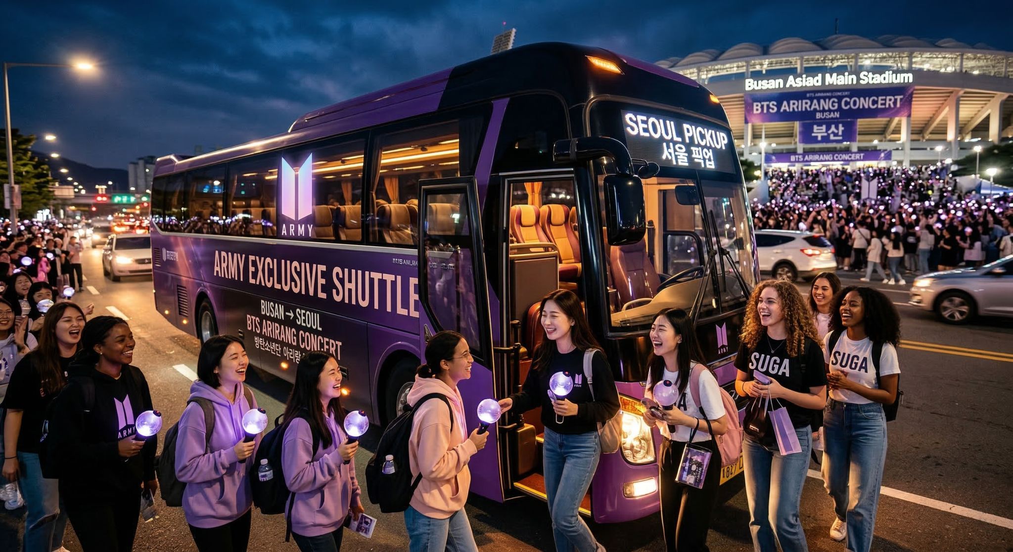 - エクスクルーシブ・プレミアムな旅: 6/12, 6/13 この特別な瞬間!BTSファンのための専用プレミアムシャトル「Seoulpickups」と共に旅立つ、釜山アシアード主競技場での2026 BTS WORLD TOUR ARIRANG!