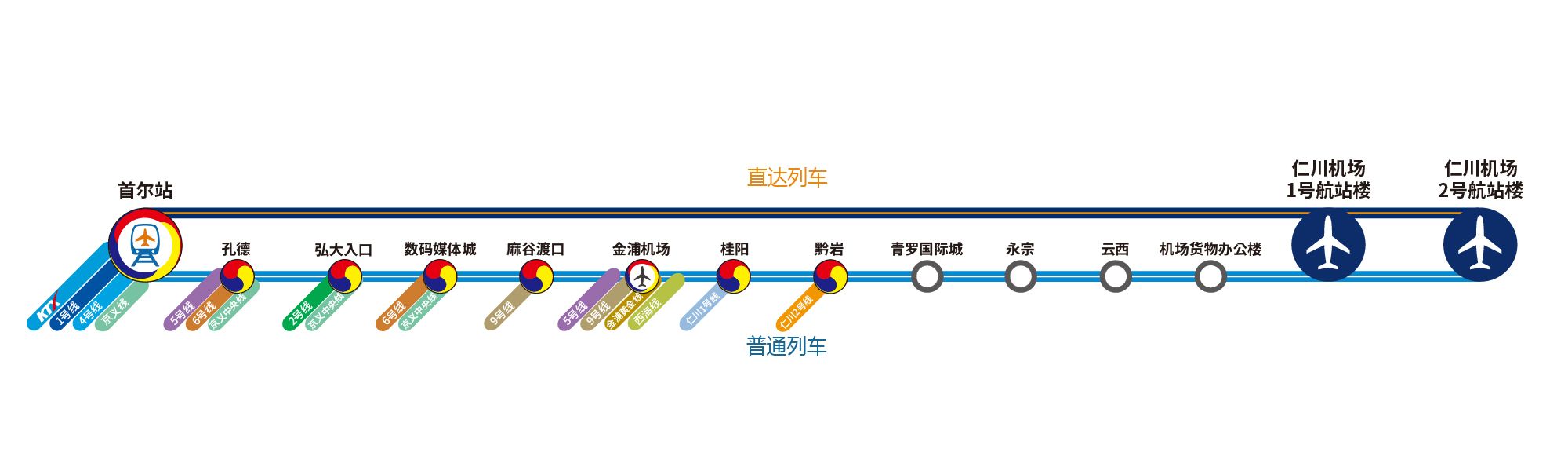 - AREX空港鉄道直通列車のチケットをオンラインで予約し、座席を事前に確保すれば、現地購入よりもスムーズかつお得にご利用いただけます。仁川空港からソウル駅まで1本、オリンピック公園や蚕室などのコンサート会場へ向かう地下鉄乗り換えも便利です。