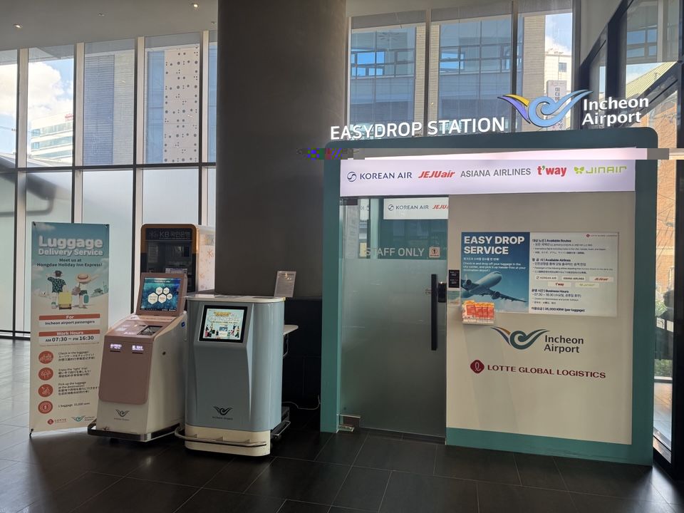 Easy-Dropは、都心センターでお預かりした手荷物を、到着空港まで一括配送するワンストップサービスです。 身軽に旅を楽しみたい方におすすめです! 指定されたセンターでチェックイン手続きを行い手荷物を預けると、到着地の空港で受け取ることができます。 ソウル中心部の3つの拠点(弘大・明洞・三成)で預けられ、快適で便利な旅行をサポートします。 仁川空港を利用する出国旅客(米州路線を除く)が対象です。 対応航空会社:大韓航空、アシアナ航空、済州航空、ティーウェイ航空、ジンエアー 営業時間 1. 弘大 07:30~16:30 2. 明洞 09:00~16:00 3. 三成 07:00~16:00 ★支店所在及び営業時間★ ★[弘大 : ソウル特別市 麻浦区 楊花路 188 AK PLAZA 1階 (Holiday Inn Express)] Tel.+82 2-6010-1220 ▶弘大 → 到着空港 1日2回(12:00 / 16:30) チェックイン・バゲージ 発送 (1次) 07:30 ~ 12:00 * (T1) 15:00、(T2) 15:30以降の航空便可能 (2次) 12:00 ~ 16:30 * (T1) 19:30, (T2) 20:00以降の航空便可能 ★[明洞 : ソウル特別市 中区 明洞8ガキル 41-1 1階] Tel.+82 2-6731-1091 ▶明洞 → 到着空港 1日2回(11:30 / 16:00) チェックイン・バゲージ 発送 1. (1次) 09:00 ~ 11:30 * (T1) 15:00, (T2) 15:30 以降の航空便可能 2. (2次) 11:30 ~ 16:00 * (T1) 19:30, (T2) 20:00以降の航空便可能 ★[三成 : ソウル特別市 江南区 テヘラン路87キル 22 2階 (韓国都心空港ターミナル)] Tel.+82 2-551-2340 ▶三成 → 到着空港 1日2回(10:30 / 16:00) チェックイン・バゲージ 発送 (1次) 07:00 ~ 10:30 * (T1) 15:00, (T2) 15:30 以降の航空便可能 (2次) 10:30 ~ 16:00 * (T1) 20:30, (T2) 21:00 以降の航空便可能