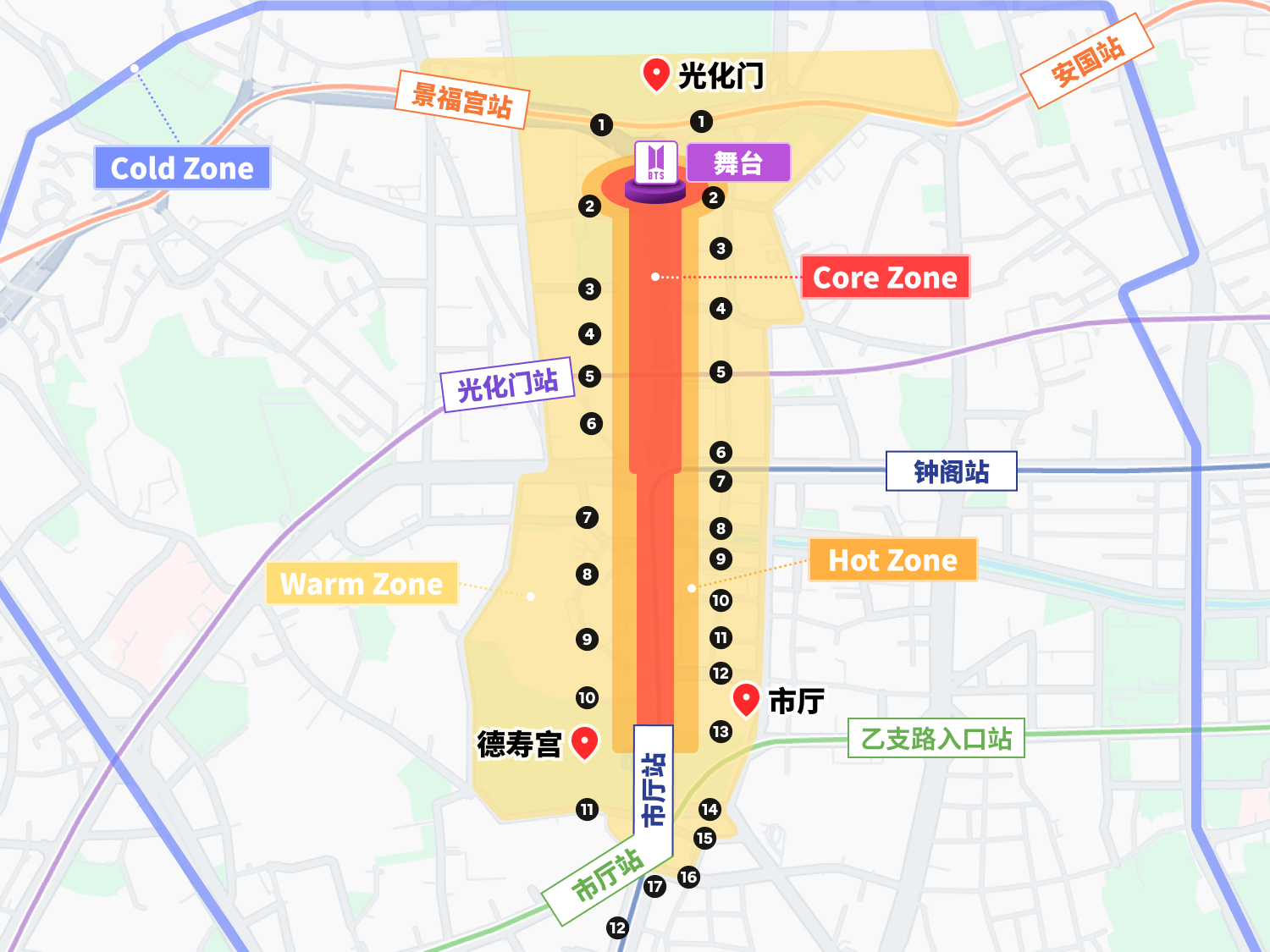 ✔️ 步行通行限制 除了作为公演场地的世宗大路外,新门内路、钟路、社稷路、栗谷路也将实行交通管制。首尔警察厅表示,将根据人流危险度及可移动程度,将活动区域划分为 4 个区域(核心区、热区、温区、冷区),并采取分级应对措施。 舞台及观众席所在的区域被划分为“核心区”和“热区”,仅允许通过指定的 29 个通道进出。预计该区域将出现极大人流,为保障您的安全,请务必听从现场警方的指挥与引导。