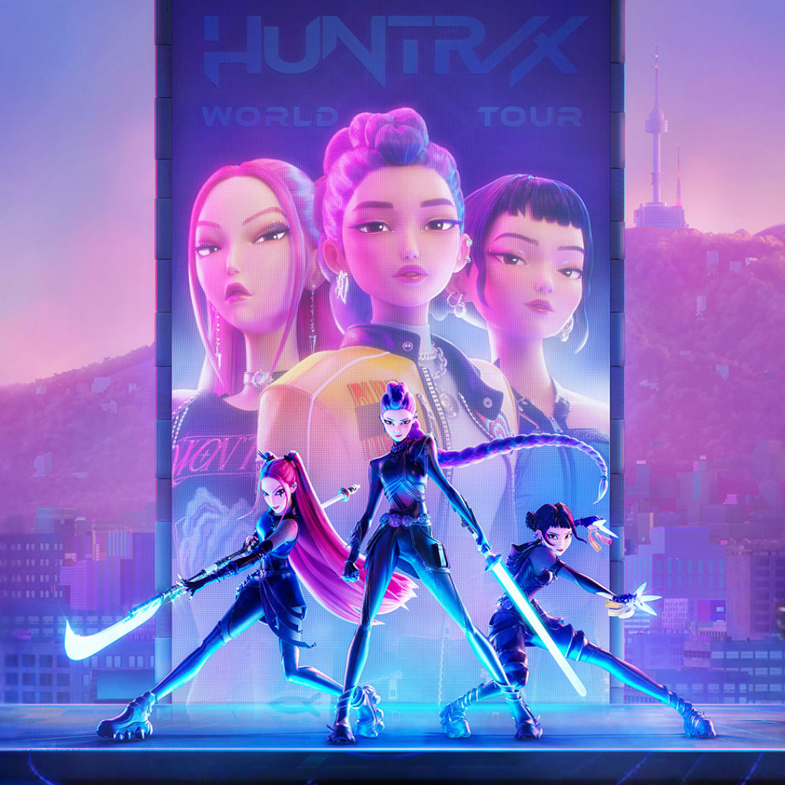 在电影海报和多个画面中反复登场的首尔象征——“N 首尔塔”。虽然现实中这里并非演出场地,但在动画中却是 Saja Boys 演唱《Your Idol》的舞台背景!