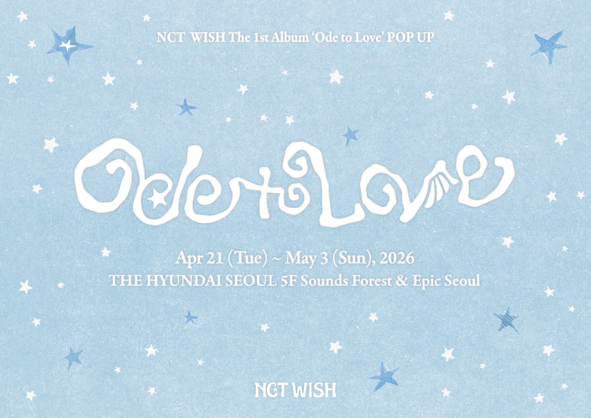 4 月 20 日,NCT WISH 将携首张正规专辑《Ode to Love》回归,并在现代百货The Hyundai Seoul 开设专属快闪店。现场准备了丰富多彩的专辑互动体验与特别活动,诚邀各位粉丝前来打卡! 📍 现代百货The Hyundai Seoul 5楼 Sounds Forest & Epic Seoul 🗓️ 2026.04.21(二)- 2026.05.03(日)